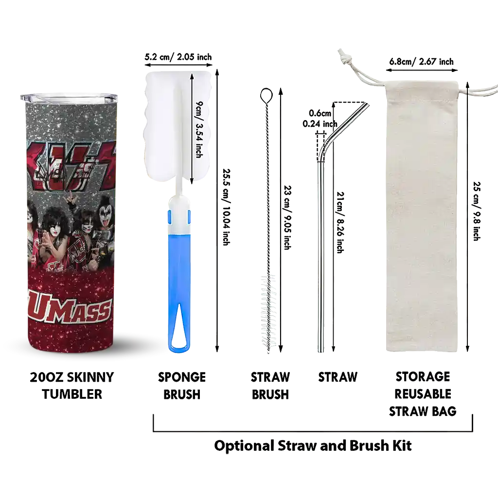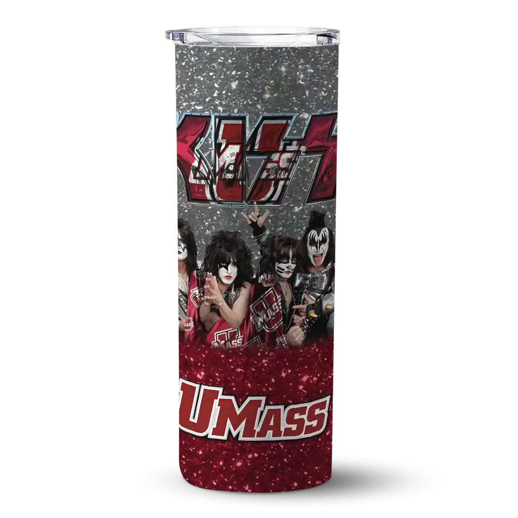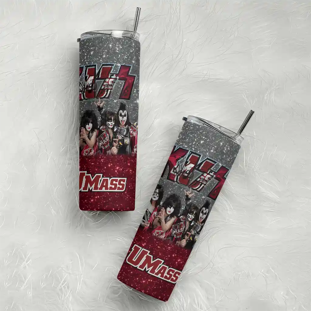 The Customized UMass Minutemen Kiss Band Grey Skinny Tumbler tumbler is the perfect way to stay refreshed while showing off your pride for UMass Minutemen. With its double-wall insulation, your drinks stay at the right temperature for hours, whether you're enjoying a hot coffee or keeping your iced drink cold. What's inside? You’ll find 1 stainless steel tumbler, 1 clear lid, and 1 removable straw. It's the perfect blend of function and fan spirit! Ergonomically designed for comfort, made from durable stainless steel, and insulated to maintain your drink’s temperature, this tumbler is a must-have for any dedicated NCAA fan.
