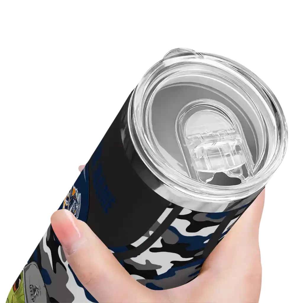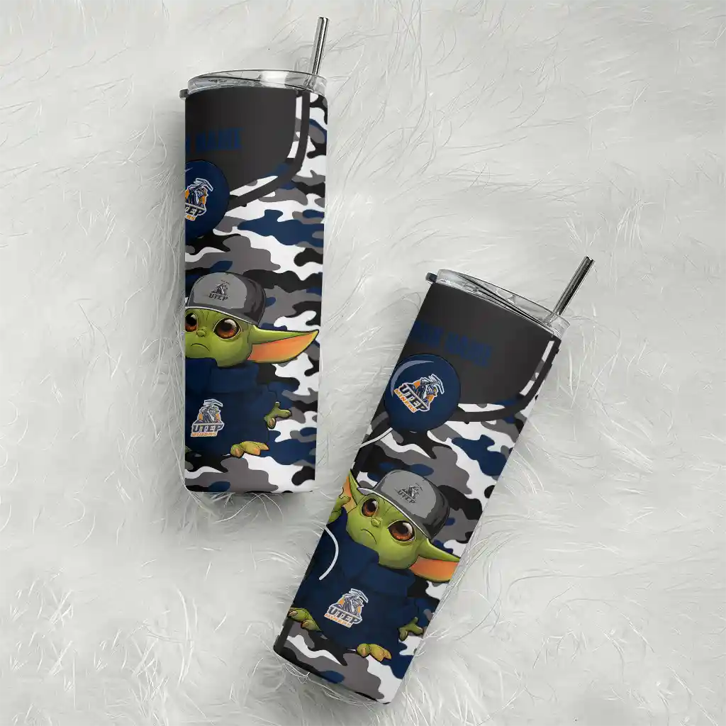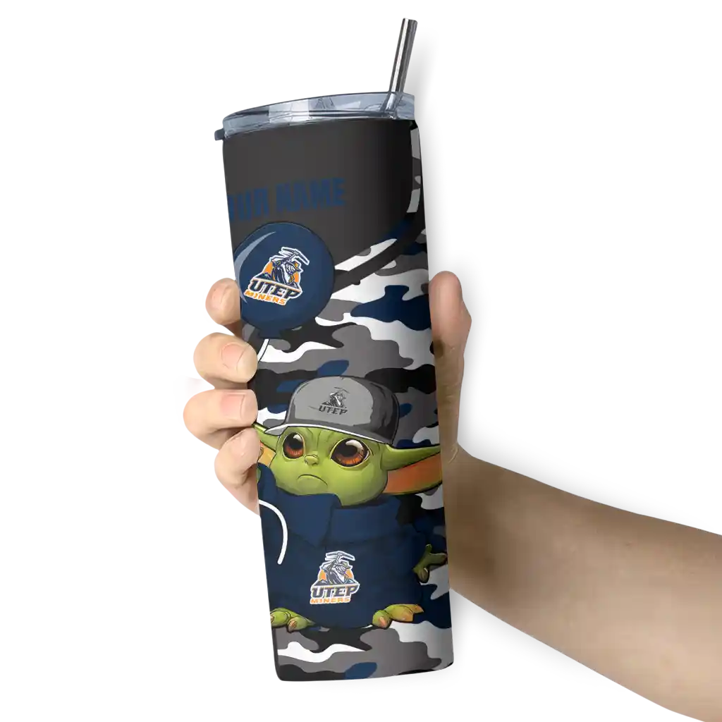 The Customized UTEP Miners Yoda Camo Blue Black Skinny Tumbler tumbler is the perfect way to stay refreshed while showing off your pride for UTEP Miners. With its double-wall insulation, your drinks stay at the right temperature for hours, whether you're enjoying a hot coffee or keeping your iced drink cold. What's inside? You’ll find 1 stainless steel tumbler, 1 clear lid, and 1 removable straw. It's the perfect blend of function and fan spirit! Ergonomically designed for comfort, made from durable stainless steel, and insulated to maintain your drink’s temperature, this tumbler is a must-have for any dedicated NCAA fan.