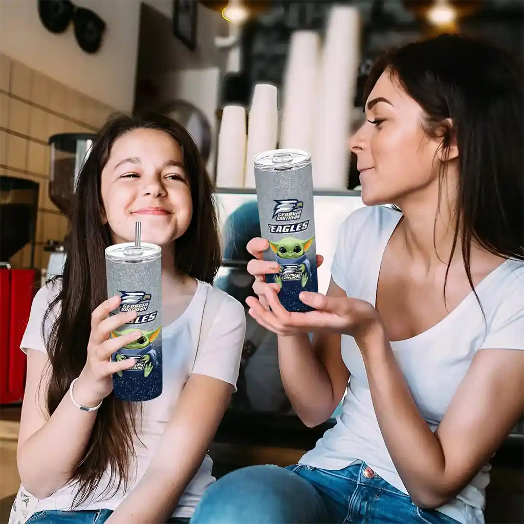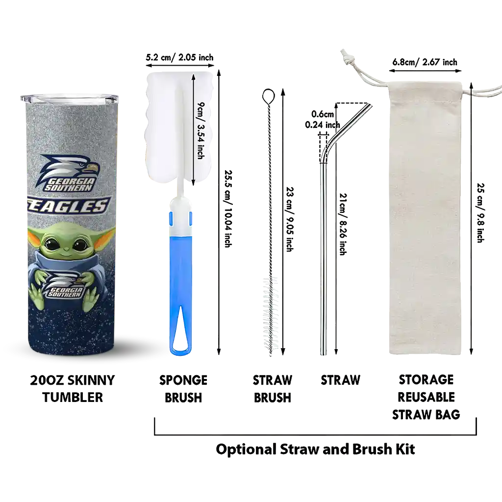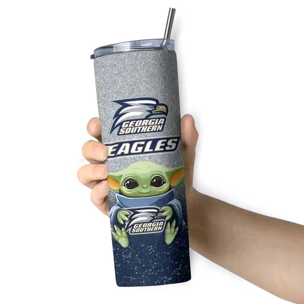 The Georgia Southern Eagles Yoda Smile Blue Skinny Tumbler tumbler is the perfect way to stay refreshed while showing off your pride for Georgia Southern Eagles. With its double-wall insulation, your drinks stay at the right temperature for hours, whether you're enjoying a hot coffee or keeping your iced drink cold. What's inside? You’ll find 1 stainless steel tumbler, 1 clear lid, and 1 removable straw. It's the perfect blend of function and fan spirit! Ergonomically designed for comfort, made from durable stainless steel, and insulated to maintain your drink’s temperature, this tumbler is a must-have for any dedicated NCAA fan.