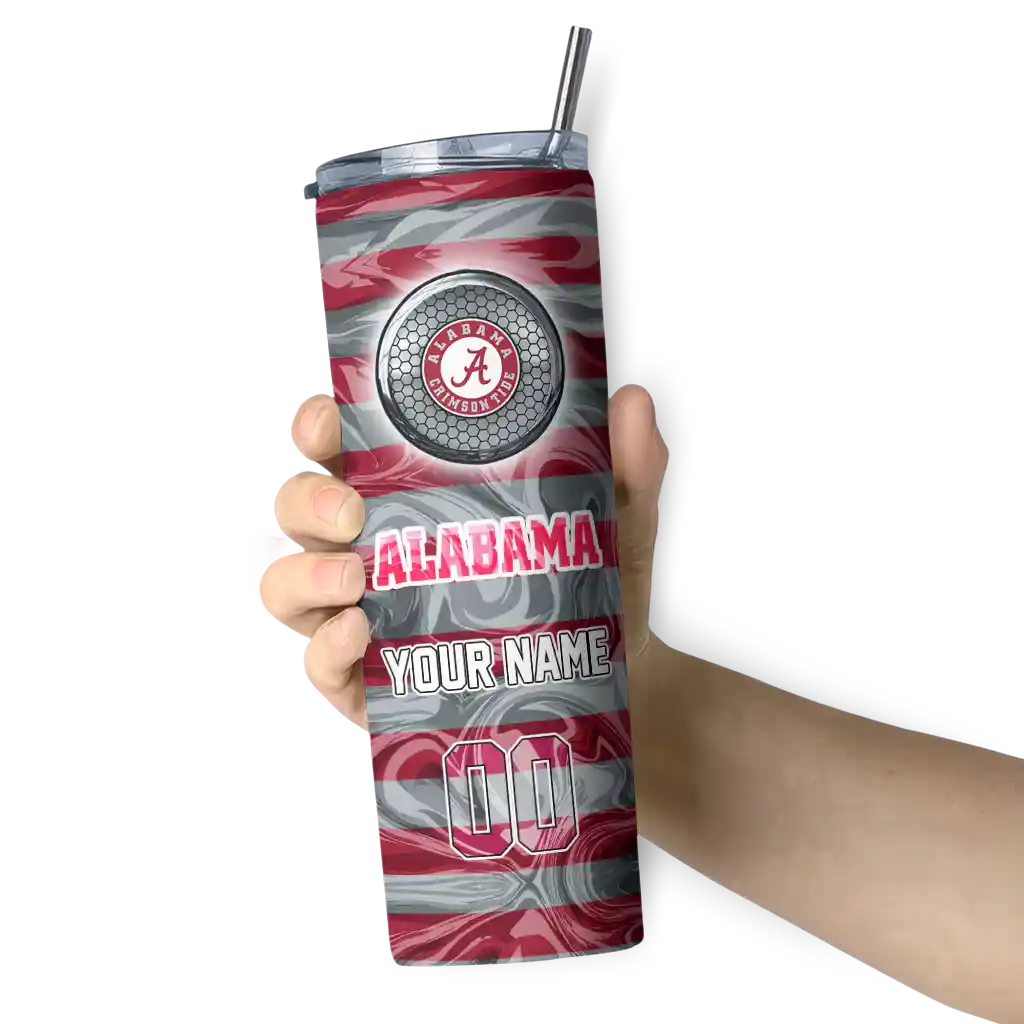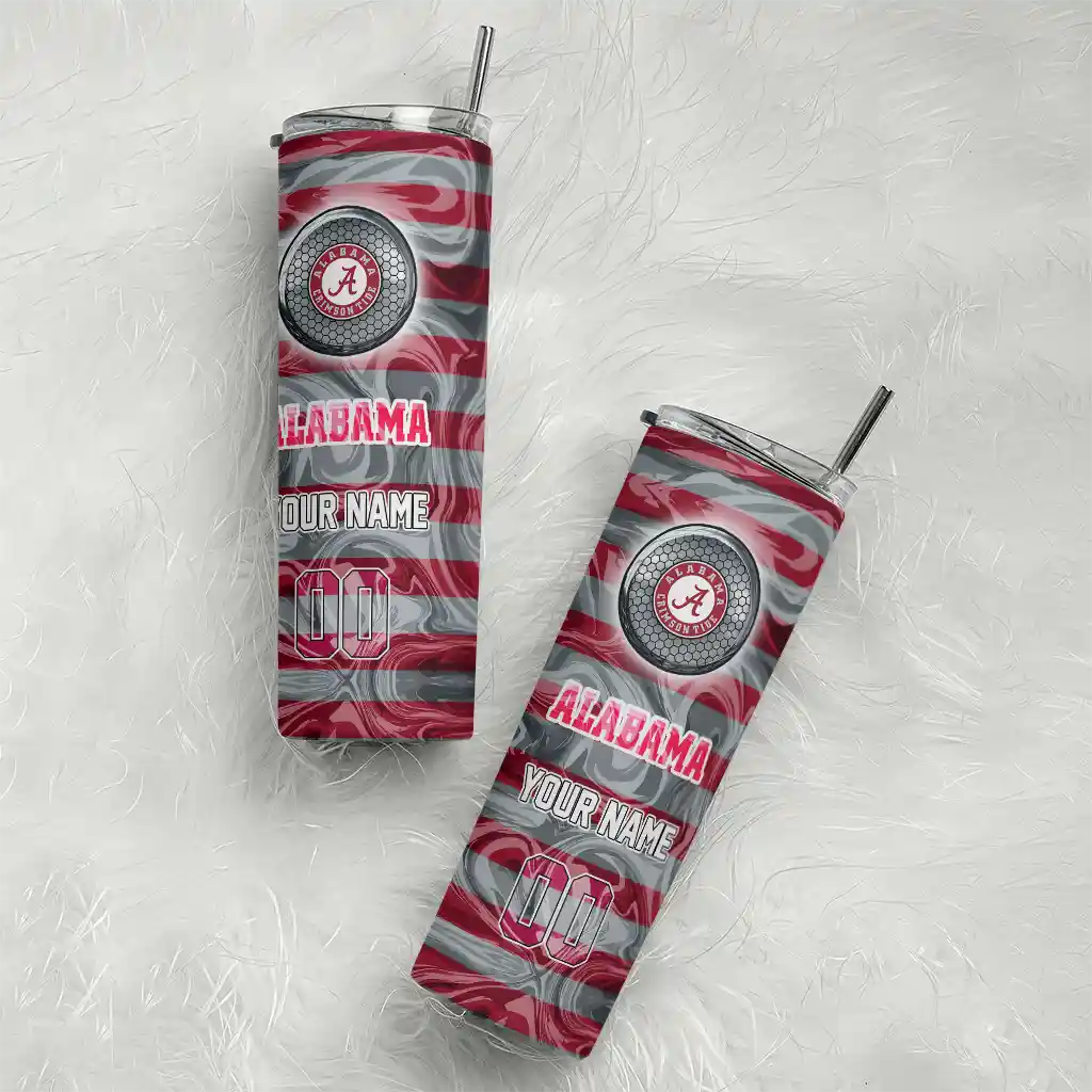 The Personalized Alabama Crimson Tide Patterned Waves Crimson Skinny Tumbler tumbler is the perfect way to stay refreshed while showing off your pride for Alabama Crimson Tide. With its double-wall insulation, your drinks stay at the right temperature for hours, whether you're enjoying a hot coffee or keeping your iced drink cold. What's inside? You’ll find 1 stainless steel tumbler, 1 clear lid, and 1 removable straw. It's the perfect blend of function and fan spirit! Ergonomically designed for comfort, made from durable stainless steel, and insulated to maintain your drink’s temperature, this tumbler is a must-have for any dedicated NCAA fan.