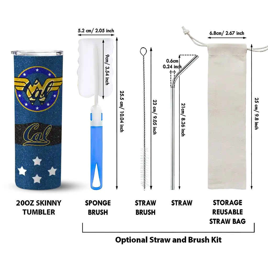The Customized California Golden Bears Chevron Patch Blue Skinny Tumbler tumbler is the perfect way to stay refreshed while showing off your pride for California Golden Bears. With its double-wall insulation, your drinks stay at the right temperature for hours, whether you're enjoying a hot coffee or keeping your iced drink cold. What's inside? You’ll find 1 stainless steel tumbler, 1 clear lid, and 1 removable straw. It's the perfect blend of function and fan spirit! Ergonomically designed for comfort, made from durable stainless steel, and insulated to maintain your drink’s temperature, this tumbler is a must-have for any dedicated NCAA fan.