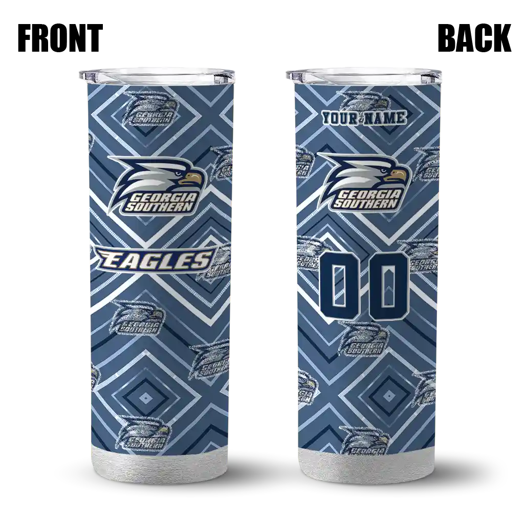 No question about it—the Custom Georgia Southern Eagles Chevron Angle Blue Curved Tumbler is the ultimate way to stay refreshed while rocking your Georgia Southern Eagles pride. From the stadium to your tailgate, or just chilling at home, this sleek tumbler makes sure you stay hydrated in style. What’s in the box? A stainless steel tumbler, clear lid, and removable straw—all the essentials for keeping your favorite drinks on point!