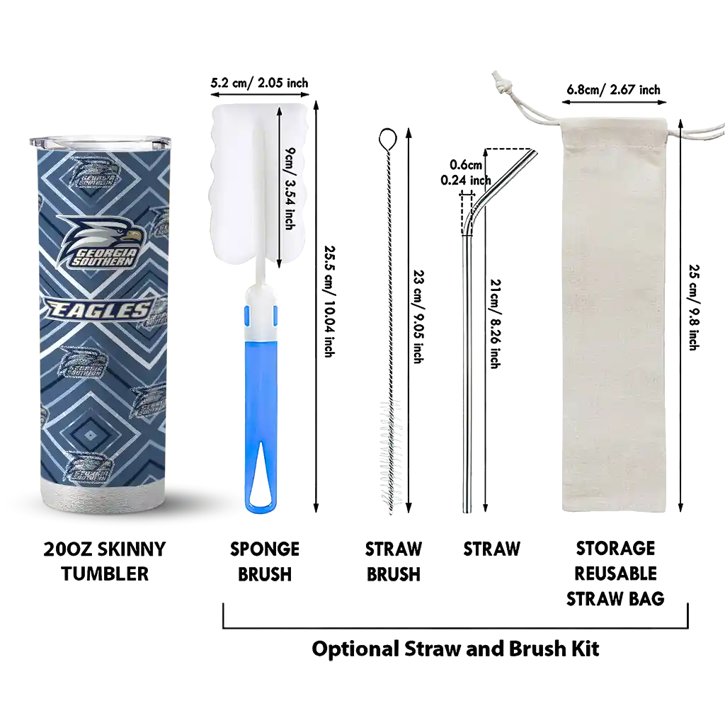 The Custom Georgia Southern Eagles Patterned Waves Blue Skinny Tumbler tumbler is the perfect way to stay refreshed while showing off your pride for Georgia Southern Eagles. With its double-wall insulation, your drinks stay at the right temperature for hours, whether you're enjoying a hot coffee or keeping your iced drink cold. What's inside? You’ll find 1 stainless steel tumbler, 1 clear lid, and 1 removable straw. It's the perfect blend of function and fan spirit! Ergonomically designed for comfort, made from durable stainless steel, and insulated to maintain your drink’s temperature, this tumbler is a must-have for any dedicated NCAA fan.