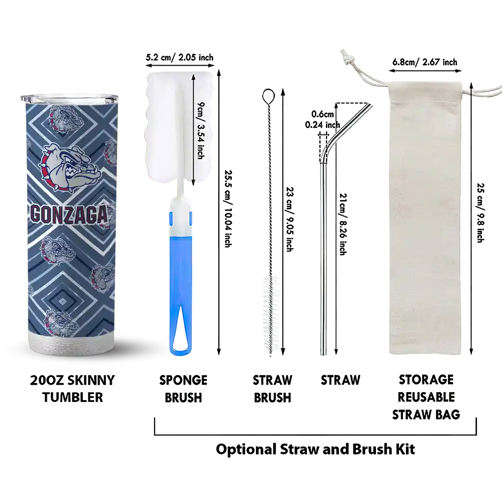 The Personalized Gonzaga Bulldogs Chevron V Blue Gray Skinny Tumbler tumbler is the perfect way to stay refreshed while showing off your pride for Gonzaga Bulldogs. With its double-wall insulation, your drinks stay at the right temperature for hours, whether you're enjoying a hot coffee or keeping your iced drink cold. What's inside? You’ll find 1 stainless steel tumbler, 1 clear lid, and 1 removable straw. It's the perfect blend of function and fan spirit! Ergonomically designed for comfort, made from durable stainless steel, and insulated to maintain your drink’s temperature, this tumbler is a must-have for any dedicated NCAA fan.
