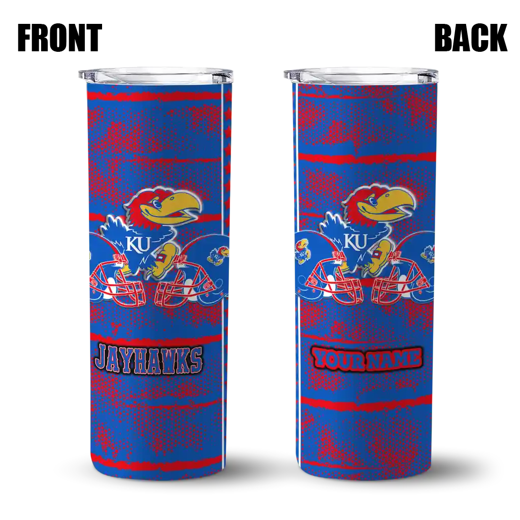 The Personalized Kansas Jayhawks Chevron Patch Blue Skinny Tumbler tumbler is the perfect way to stay refreshed while showing off your pride for Kansas Jayhawks. With its double-wall insulation, your drinks stay at the right temperature for hours, whether you're enjoying a hot coffee or keeping your iced drink cold. What's inside? You’ll find 1 stainless steel tumbler, 1 clear lid, and 1 removable straw. It's the perfect blend of function and fan spirit! Ergonomically designed for comfort, made from durable stainless steel, and insulated to maintain your drink’s temperature, this tumbler is a must-have for any dedicated NCAA fan.