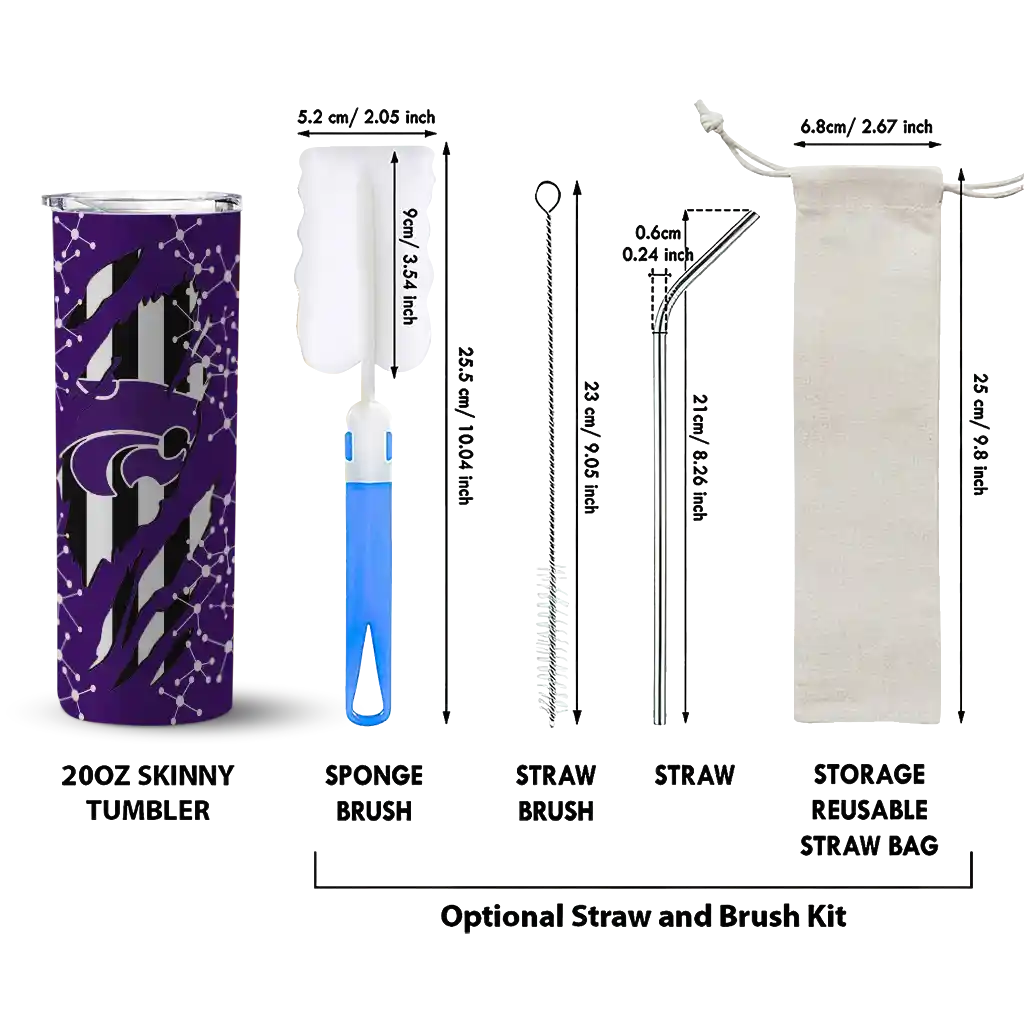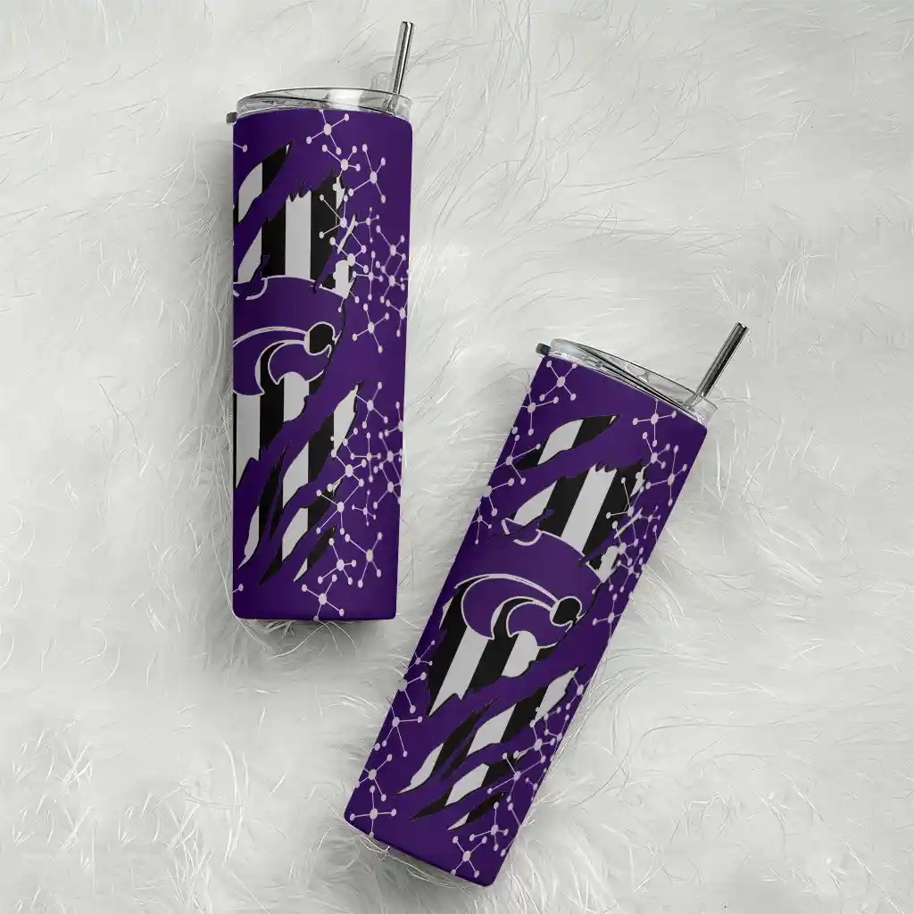 The Customized Kansas State Wildcats Helmet Clash Purple Skinny Tumbler tumbler is the perfect way to stay refreshed while showing off your pride for Kansas State Wildcats. With its double-wall insulation, your drinks stay at the right temperature for hours, whether you're enjoying a hot coffee or keeping your iced drink cold. What's inside? You’ll find 1 stainless steel tumbler, 1 clear lid, and 1 removable straw. It's the perfect blend of function and fan spirit! Ergonomically designed for comfort, made from durable stainless steel, and insulated to maintain your drink’s temperature, this tumbler is a must-have for any dedicated NCAA fan.
