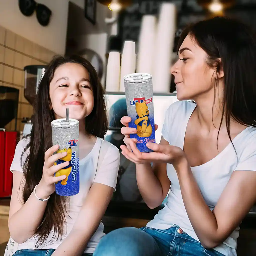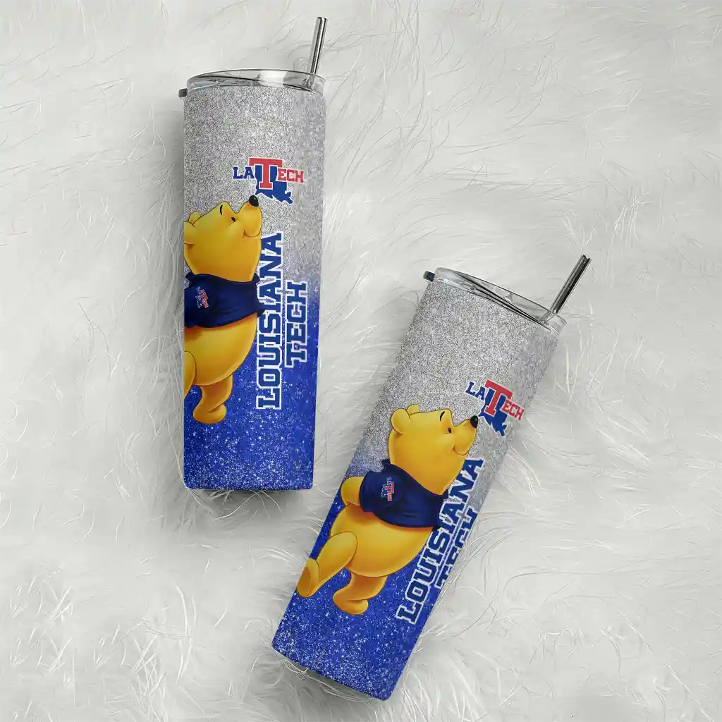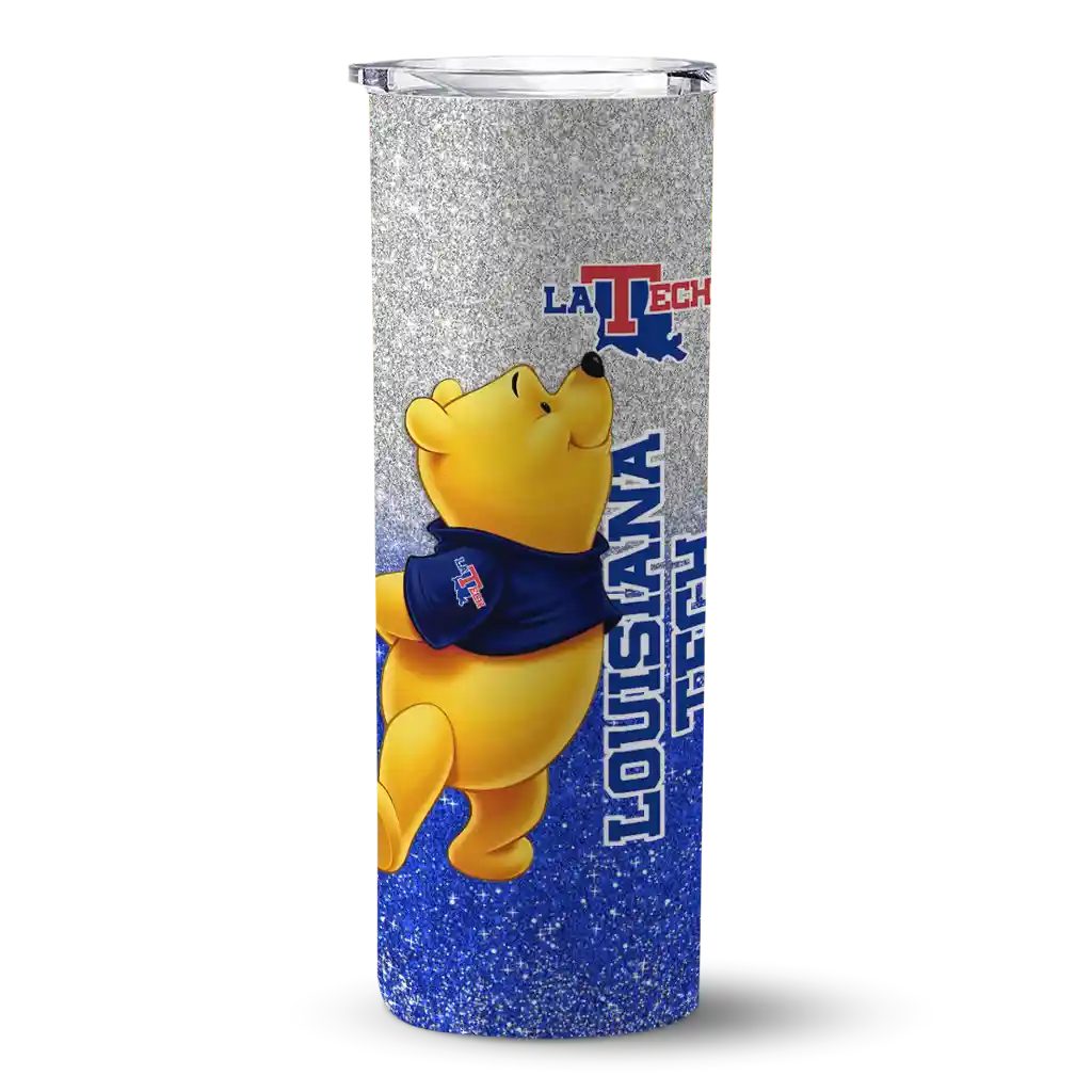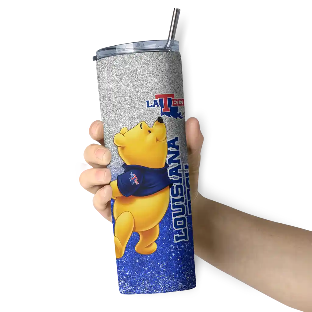 The Personalized LA Tech Winnie the Pooh Blue Gray Skinny Tumbler tumbler is the perfect way to stay refreshed while showing off your pride for LA Tech. With its double-wall insulation, your drinks stay at the right temperature for hours, whether you're enjoying a hot coffee or keeping your iced drink cold. What's inside? You’ll find 1 stainless steel tumbler, 1 clear lid, and 1 removable straw. It's the perfect blend of function and fan spirit! Ergonomically designed for comfort, made from durable stainless steel, and insulated to maintain your drink’s temperature, this tumbler is a must-have for any dedicated NCAA fan.