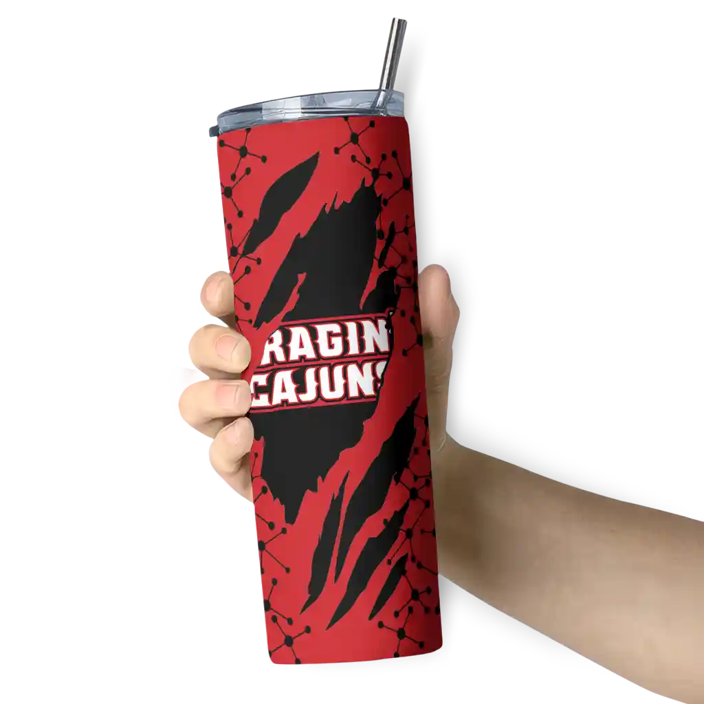 The Personalized Louisiana Ragin’ Cajuns Star Pop Red Black Skinny Tumbler tumbler is the perfect way to stay refreshed while showing off your pride for Louisiana Ragin’ Cajuns. With its double-wall insulation, your drinks stay at the right temperature for hours, whether you're enjoying a hot coffee or keeping your iced drink cold. What's inside? You’ll find 1 stainless steel tumbler, 1 clear lid, and 1 removable straw. It's the perfect blend of function and fan spirit! Ergonomically designed for comfort, made from durable stainless steel, and insulated to maintain your drink’s temperature, this tumbler is a must-have for any dedicated NCAA fan.