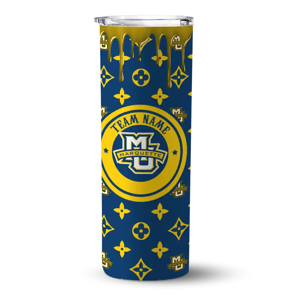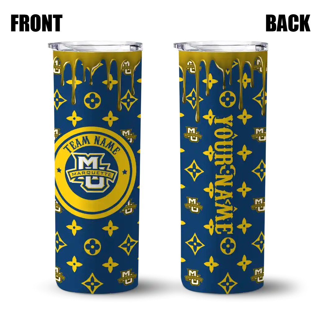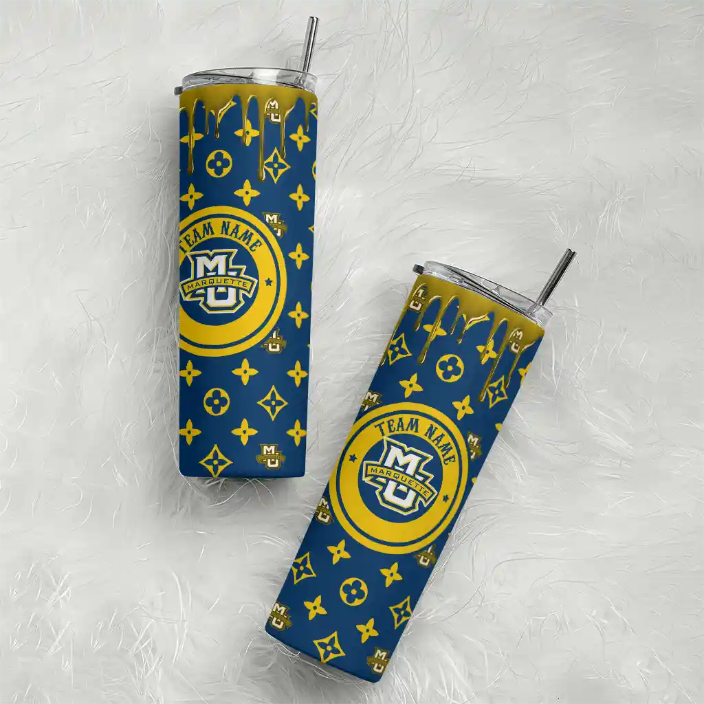 The Custom Marquette Golden Eagles Swirl Texture Blue Skinny Tumbler tumbler is the perfect way to stay refreshed while showing off your pride for Marquette Golden Eagles. With its double-wall insulation, your drinks stay at the right temperature for hours, whether you're enjoying a hot coffee or keeping your iced drink cold. What's inside? You’ll find 1 stainless steel tumbler, 1 clear lid, and 1 removable straw. It's the perfect blend of function and fan spirit! Ergonomically designed for comfort, made from durable stainless steel, and insulated to maintain your drink’s temperature, this tumbler is a must-have for any dedicated NCAA fan.