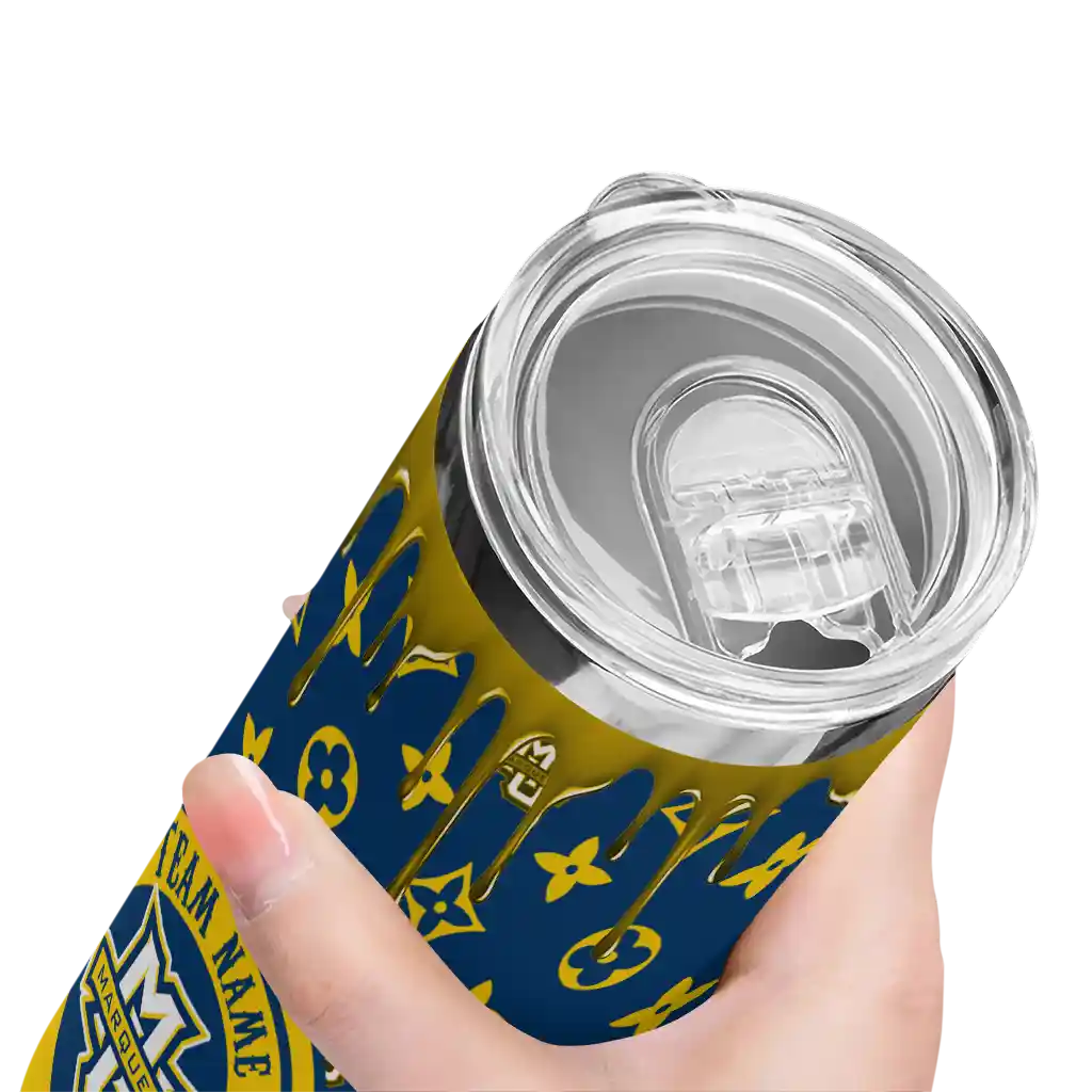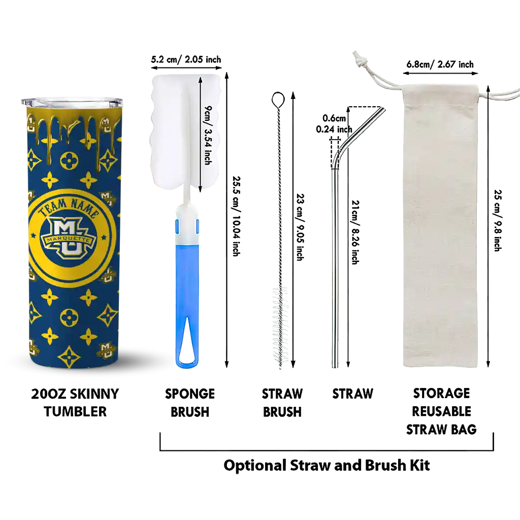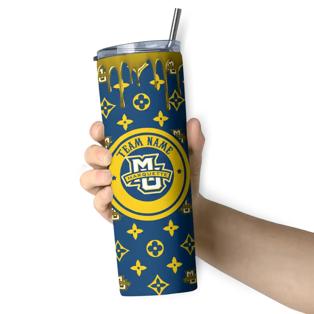 The Custom Marquette Golden Eagles Swirl Texture Blue Skinny Tumbler tumbler is the perfect way to stay refreshed while showing off your pride for Marquette Golden Eagles. With its double-wall insulation, your drinks stay at the right temperature for hours, whether you're enjoying a hot coffee or keeping your iced drink cold. What's inside? You’ll find 1 stainless steel tumbler, 1 clear lid, and 1 removable straw. It's the perfect blend of function and fan spirit! Ergonomically designed for comfort, made from durable stainless steel, and insulated to maintain your drink’s temperature, this tumbler is a must-have for any dedicated NCAA fan.