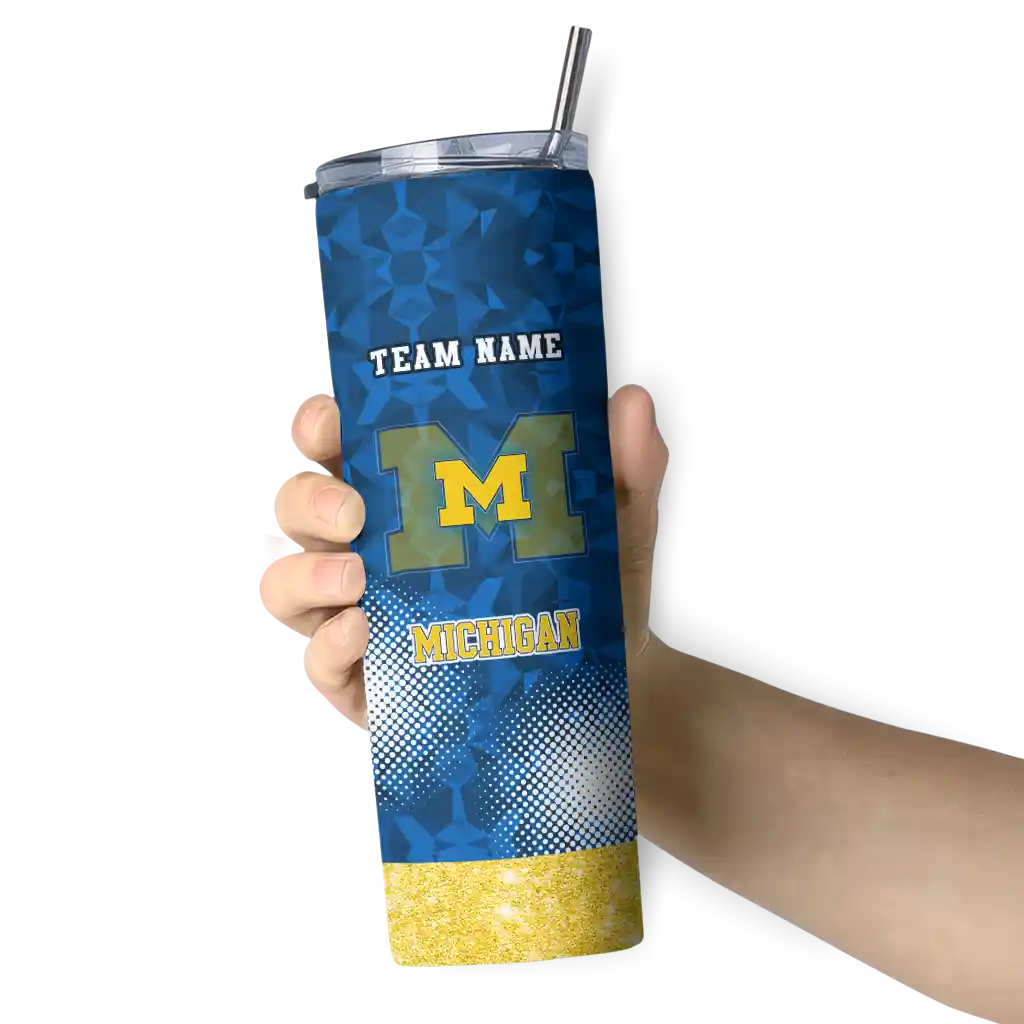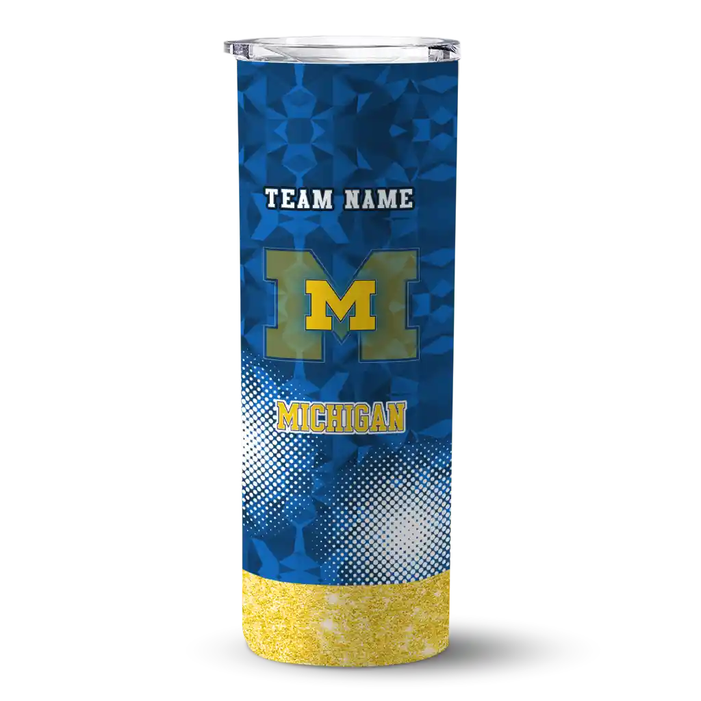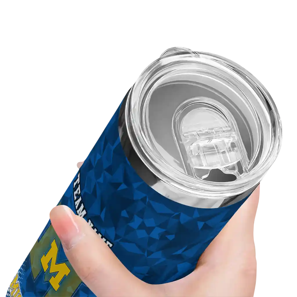 The Customized Michigan Wolverines Star Pop Blue Black Skinny Tumbler tumbler is the perfect way to stay refreshed while showing off your pride for Michigan Wolverines. With its double-wall insulation, your drinks stay at the right temperature for hours, whether you're enjoying a hot coffee or keeping your iced drink cold. What's inside? You’ll find 1 stainless steel tumbler, 1 clear lid, and 1 removable straw. It's the perfect blend of function and fan spirit! Ergonomically designed for comfort, made from durable stainless steel, and insulated to maintain your drink’s temperature, this tumbler is a must-have for any dedicated NCAA fan.
