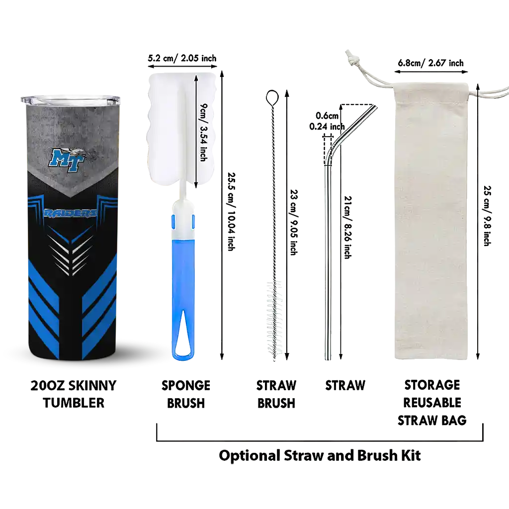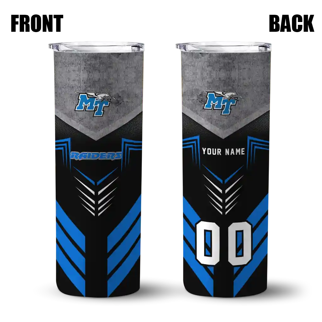 The Custom Middle Tennessee Blue Raiders Zipper Leopard Blue Skinny Tumbler tumbler is the perfect way to stay refreshed while showing off your pride for Middle Tennessee Blue Raiders. With its double-wall insulation, your drinks stay at the right temperature for hours, whether you're enjoying a hot coffee or keeping your iced drink cold. What's inside? You’ll find 1 stainless steel tumbler, 1 clear lid, and 1 removable straw. It's the perfect blend of function and fan spirit! Ergonomically designed for comfort, made from durable stainless steel, and insulated to maintain your drink’s temperature, this tumbler is a must-have for any dedicated NCAA fan.