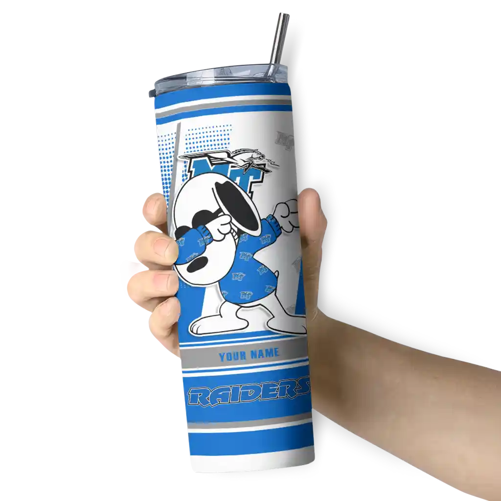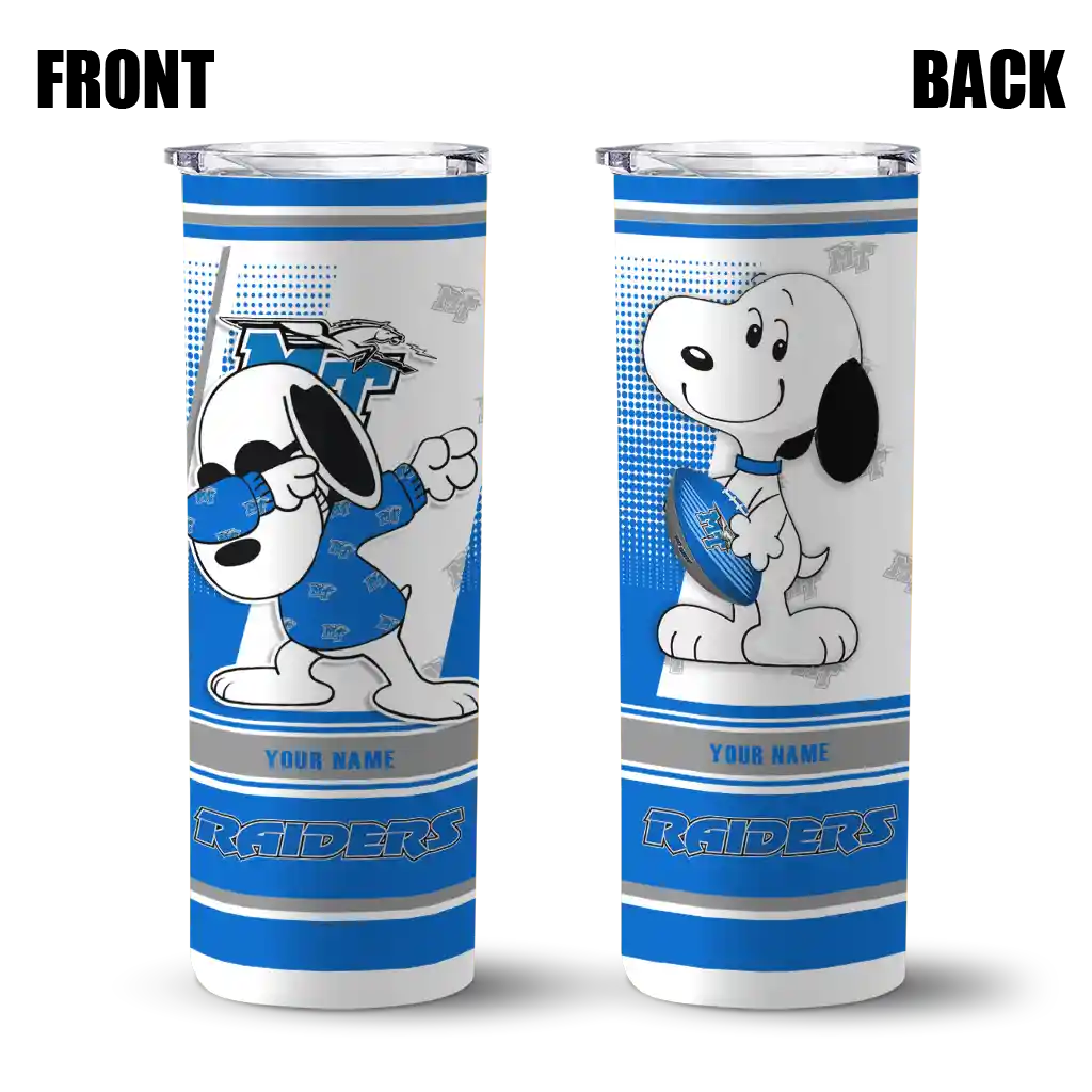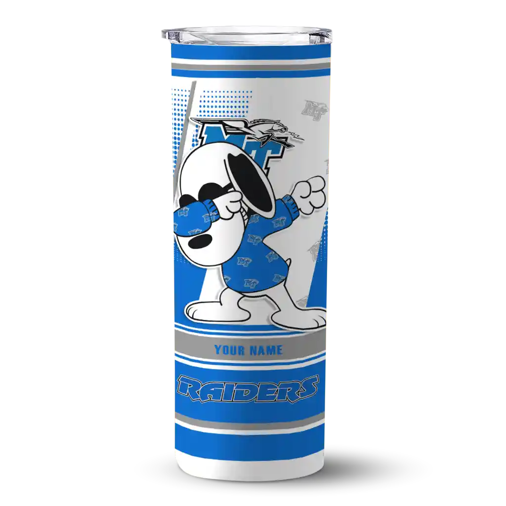 Personalized Middle Tennessee Blue Raiders Snoopy Dog Blue White Skinny Tumbler
