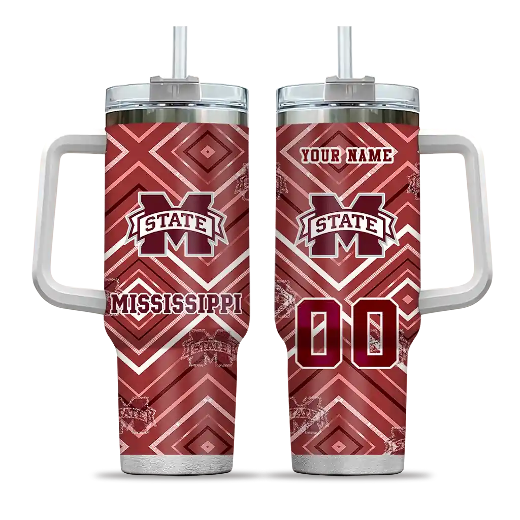 The Mississippi State Bulldogs Curved Tumbler – Personalized Bold Diamonds Maroon is a double-wall insulated stainless steel tumbler designed to maintain your beverage’s ideal temperature. It features an ergonomic curved design for an easy grip and a tough stainless steel build. The item includes the tumbler, a clear lid, and a removable straw. It is easy to clean and low-maintenance. You can personalize this tumbler by adding both a custom name and number of your choice during the ordering process.