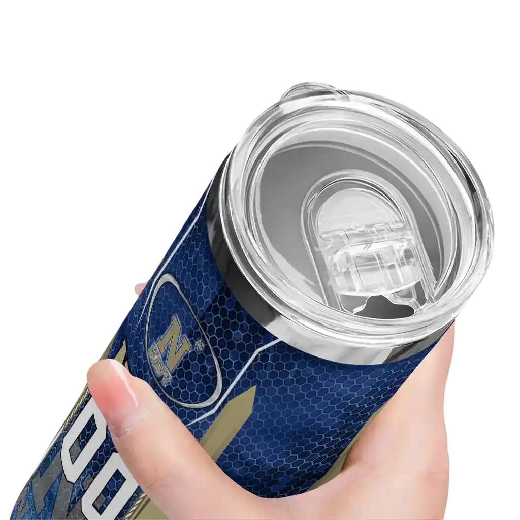 The Personalized Navy Midshipmen Stacked Diamond Blue Skinny Tumbler tumbler is the perfect way to stay refreshed while showing off your pride for Navy Midshipmen. With its double-wall insulation, your drinks stay at the right temperature for hours, whether you're enjoying a hot coffee or keeping your iced drink cold. What's inside? You’ll find 1 stainless steel tumbler, 1 clear lid, and 1 removable straw. It's the perfect blend of function and fan spirit! Ergonomically designed for comfort, made from durable stainless steel, and insulated to maintain your drink’s temperature, this tumbler is a must-have for any dedicated NCAA fan.
