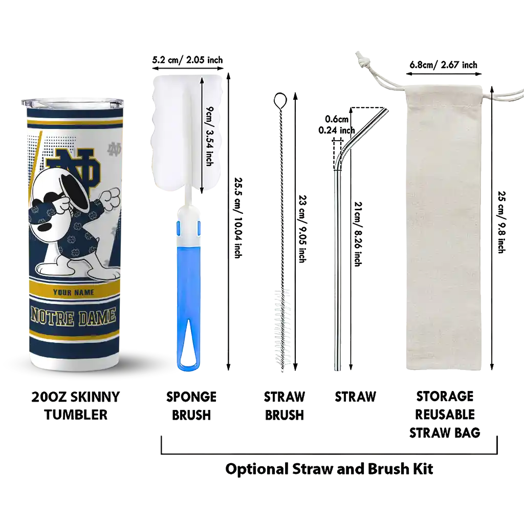 The Personalized Notre Dame Fighting Irish Snoopy Dog Navy White Skinny Tumbler tumbler is the perfect way to stay refreshed while showing off your pride for Notre Dame Fighting Irish. With its double-wall insulation, your drinks stay at the right temperature for hours, whether you're enjoying a hot coffee or keeping your iced drink cold. What's inside? You’ll find 1 stainless steel tumbler, 1 clear lid, and 1 removable straw. It's the perfect blend of function and fan spirit! Ergonomically designed for comfort, made from durable stainless steel, and insulated to maintain your drink’s temperature, this tumbler is a must-have for any dedicated NCAA fan.