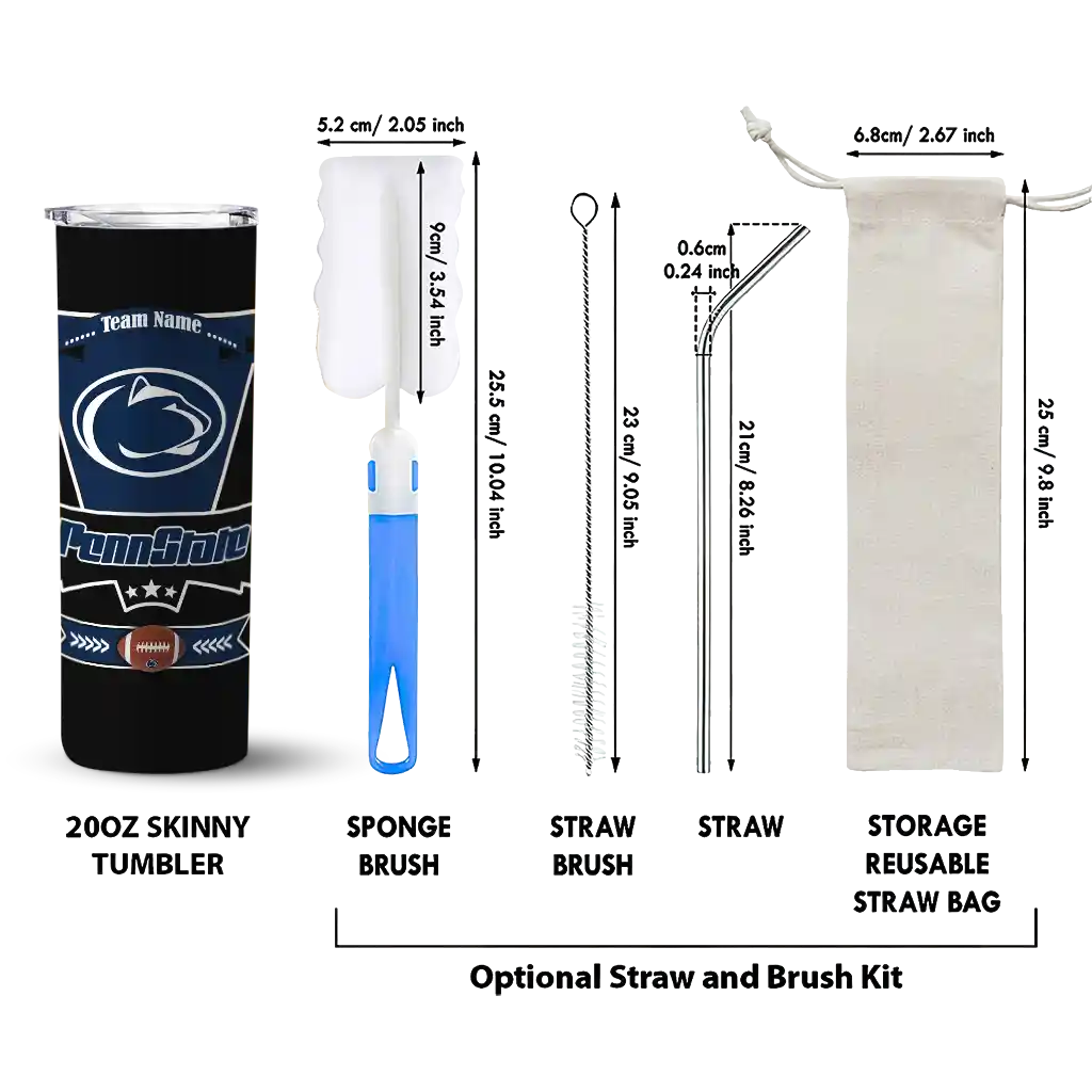 The Personalized Penn State Nittany Lions Helmet Belt Blue Black Skinny Tumbler tumbler is the perfect way to stay refreshed while showing off your pride for Penn State Nittany Lions. With its double-wall insulation, your drinks stay at the right temperature for hours, whether you're enjoying a hot coffee or keeping your iced drink cold. What's inside? You’ll find 1 stainless steel tumbler, 1 clear lid, and 1 removable straw. It's the perfect blend of function and fan spirit! Ergonomically designed for comfort, made from durable stainless steel, and insulated to maintain your drink’s temperature, this tumbler is a must-have for any dedicated NCAA fan.