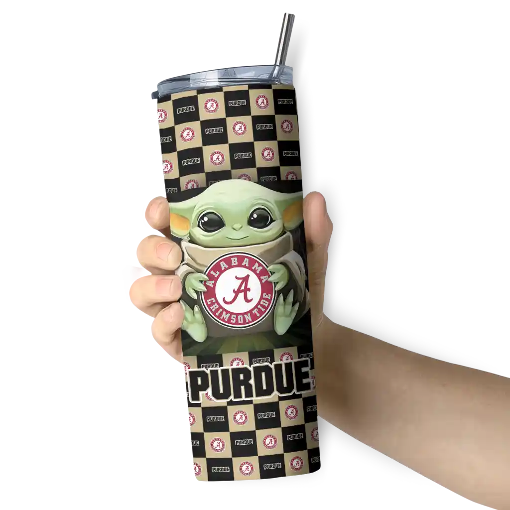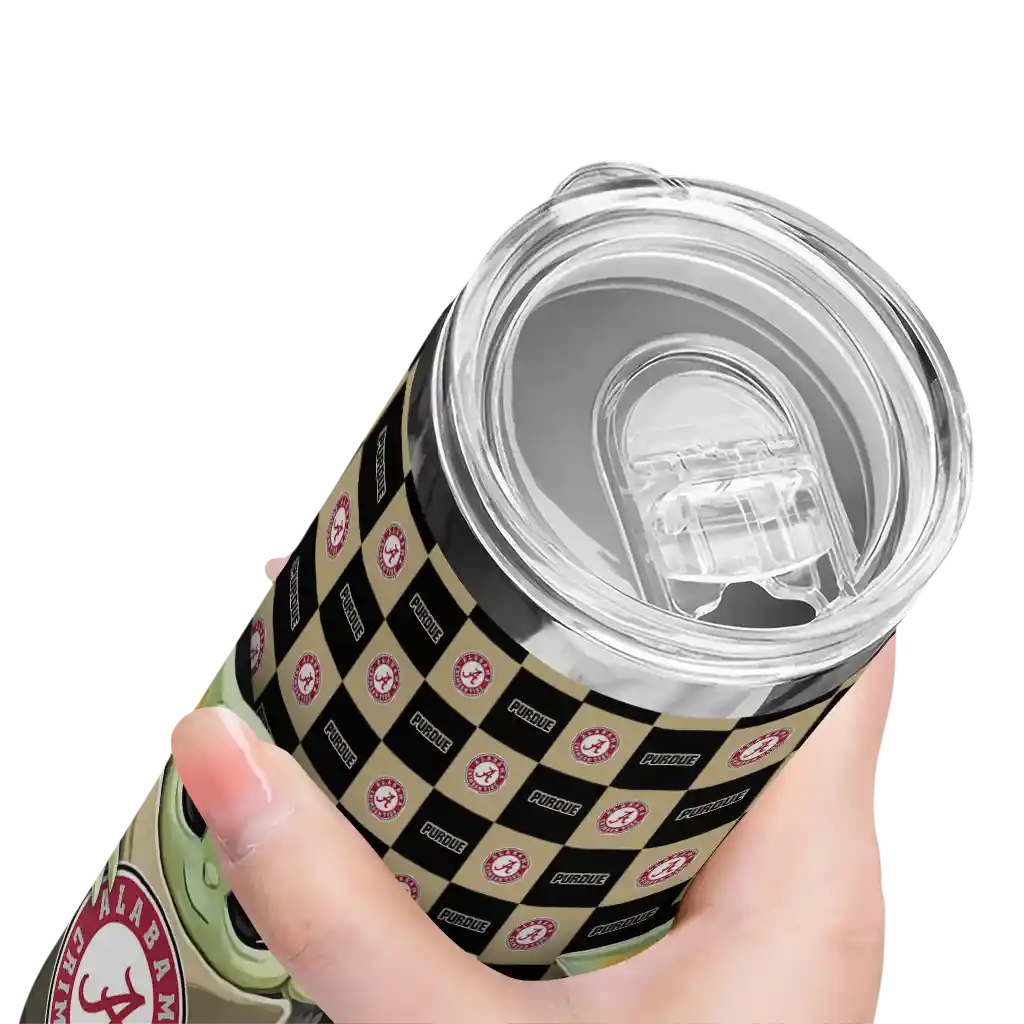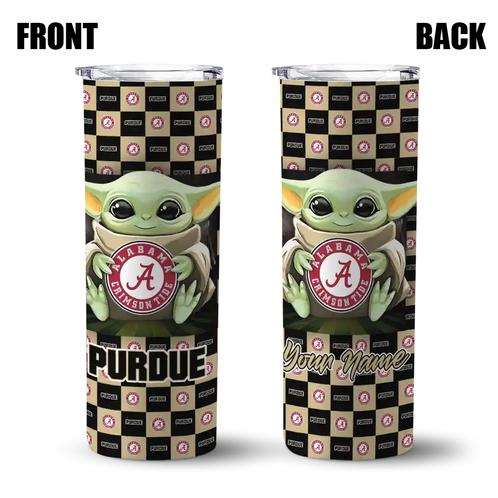 The Personalized Purdue Boilermakers Yoda Cozy Gold Black Skinny Tumbler tumbler is the perfect way to stay refreshed while showing off your pride for Purdue Boilermakers. With its double-wall insulation, your drinks stay at the right temperature for hours, whether you're enjoying a hot coffee or keeping your iced drink cold. What's inside? You’ll find 1 stainless steel tumbler, 1 clear lid, and 1 removable straw. It's the perfect blend of function and fan spirit! Ergonomically designed for comfort, made from durable stainless steel, and insulated to maintain your drink’s temperature, this tumbler is a must-have for any dedicated NCAA fan.