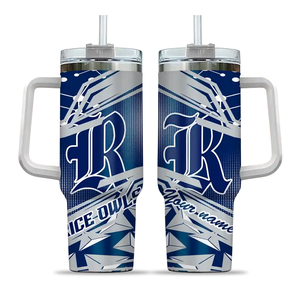 The Rice Owls Curved Tumbler – Customized Claw Cut Navy Blue Black is a double-wall insulated stainless steel tumbler designed to maintain your beverage’s ideal temperature. It features an ergonomic curved design for an easy grip and a tough stainless steel build. The item includes the tumbler, a clear lid, and a removable straw. It is easy to clean and low-maintenance. You can personalize this tumbler by adding both a custom name and number of your choice during the ordering process.