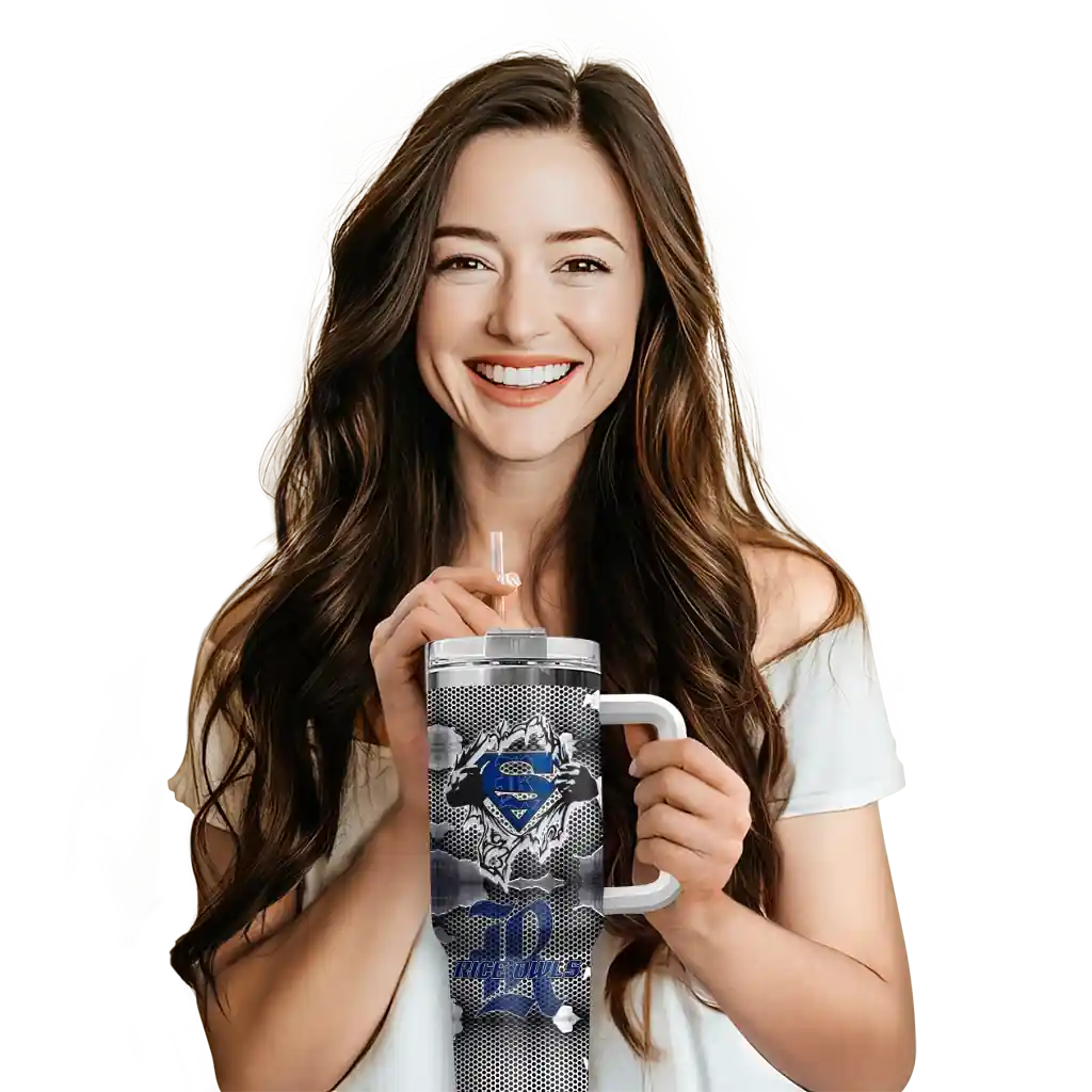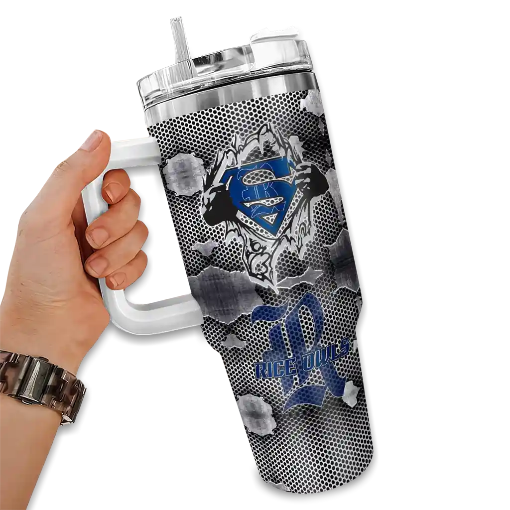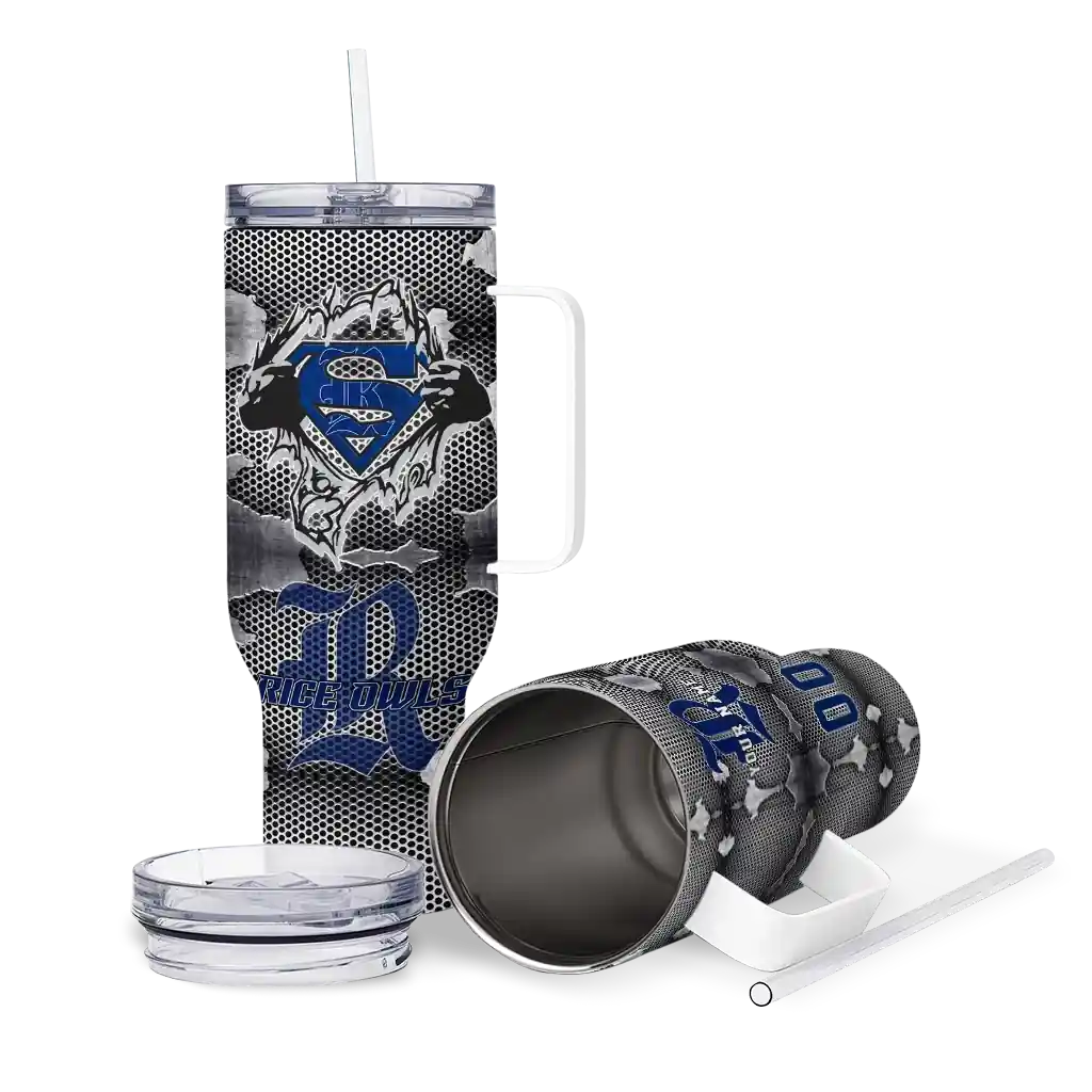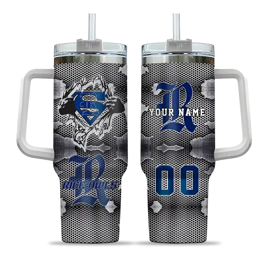 The Rice Owls Curved Tumbler – Personalized Superman Shield Navy Blue Gray is a double-wall insulated stainless steel tumbler designed to maintain your beverage’s ideal temperature. It features an ergonomic curved design for an easy grip and a tough stainless steel build. The item includes the tumbler, a clear lid, and a removable straw. It is easy to clean and low-maintenance. You can personalize this tumbler by adding both a custom name and number of your choice during the ordering process.