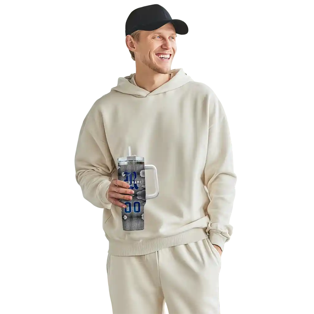 The Rice Owls Curved Tumbler – Customized Chevron Angle Navy Blue is a double-wall insulated stainless steel tumbler designed to maintain your beverage’s ideal temperature. It features an ergonomic curved design for an easy grip and a tough stainless steel build. The item includes the tumbler, a clear lid, and a removable straw. It is easy to clean and low-maintenance. You can personalize this tumbler by adding both a custom name and number of your choice during the ordering process.