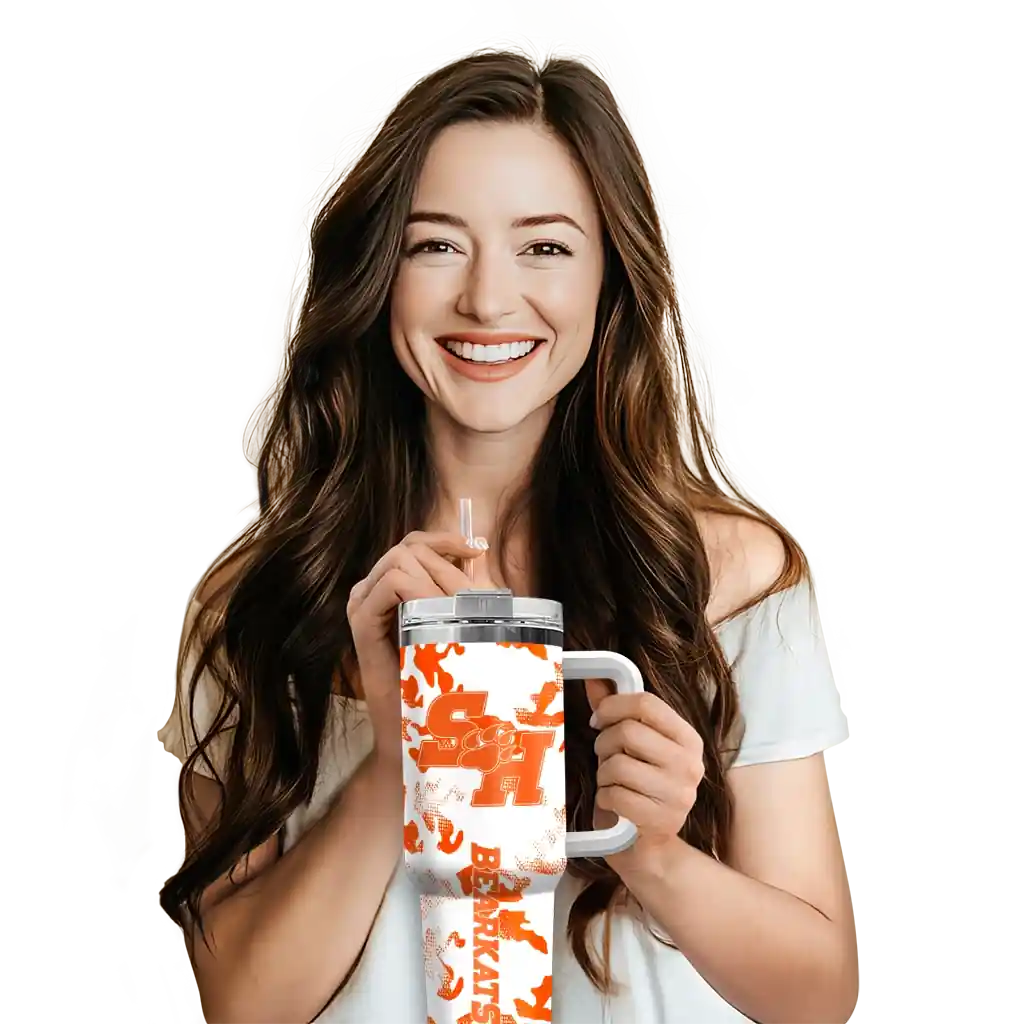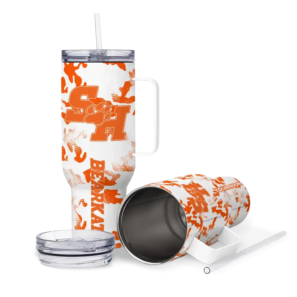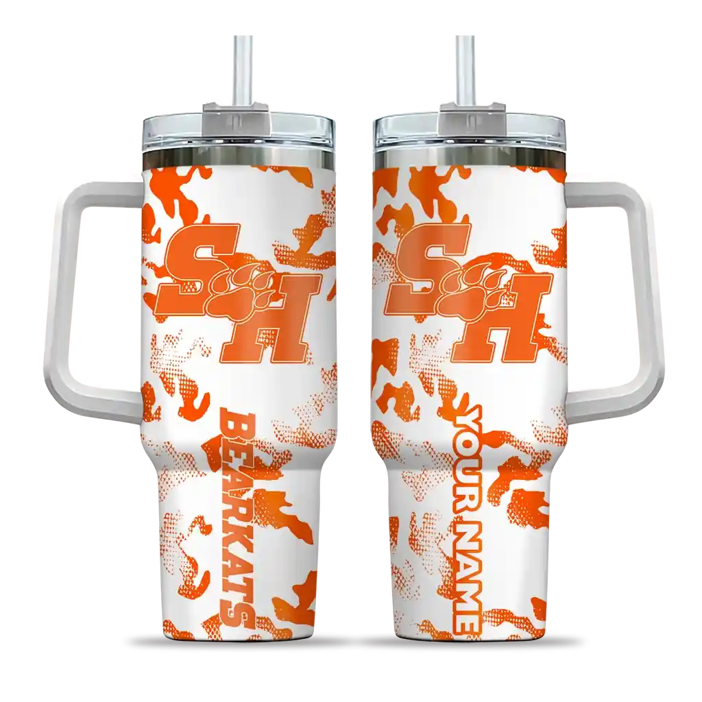 No question about it—the Personalized Sam Houston Bearkats Camo Mashup Orange White Curved Tumbler is the ultimate way to stay refreshed while rocking your Sam Houston Bearkats pride. From the stadium to your tailgate, or just chilling at home, this sleek tumbler makes sure you stay hydrated in style. What’s in the box? A stainless steel tumbler, clear lid, and removable straw—all the essentials for keeping your favorite drinks on point!