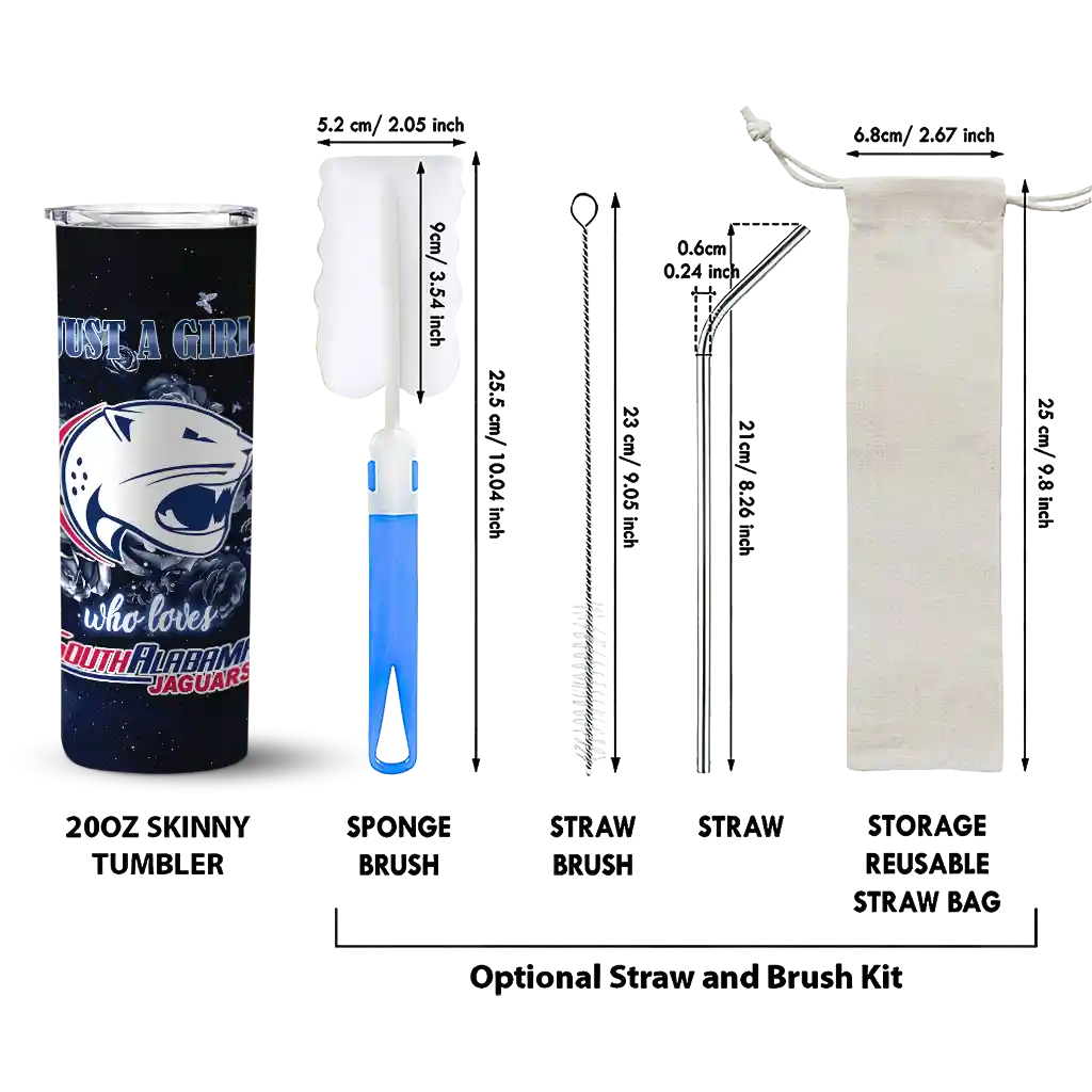 The Personalized South Alabama Jaguars Rose Romance Blue Black Skinny Tumbler tumbler is the perfect way to stay refreshed while showing off your pride for South Alabama Jaguars. With its double-wall insulation, your drinks stay at the right temperature for hours, whether you're enjoying a hot coffee or keeping your iced drink cold. What's inside? You’ll find 1 stainless steel tumbler, 1 clear lid, and 1 removable straw. It's the perfect blend of function and fan spirit! Ergonomically designed for comfort, made from durable stainless steel, and insulated to maintain your drink’s temperature, this tumbler is a must-have for any dedicated NCAA fan.