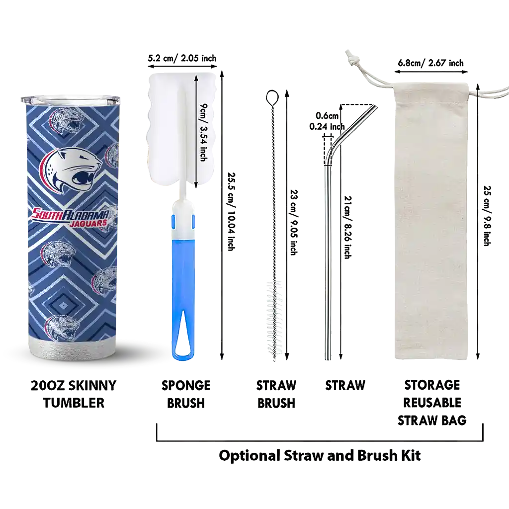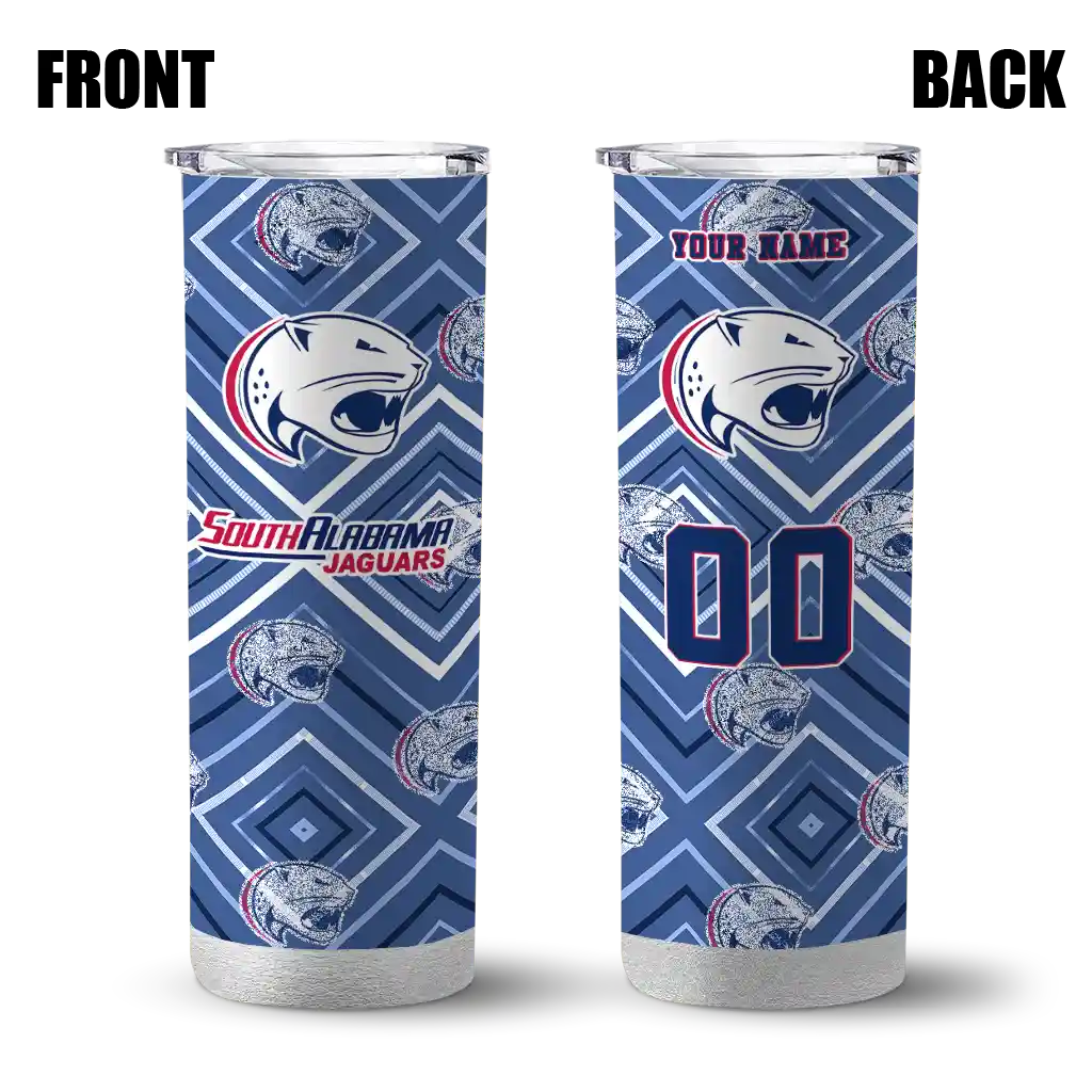 The Custom South Alabama Jaguars Web Stripes Blue White Skinny Tumbler tumbler is the perfect way to stay refreshed while showing off your pride for South Alabama Jaguars. With its double-wall insulation, your drinks stay at the right temperature for hours, whether you're enjoying a hot coffee or keeping your iced drink cold. What's inside? You’ll find 1 stainless steel tumbler, 1 clear lid, and 1 removable straw. It's the perfect blend of function and fan spirit! Ergonomically designed for comfort, made from durable stainless steel, and insulated to maintain your drink’s temperature, this tumbler is a must-have for any dedicated NCAA fan.