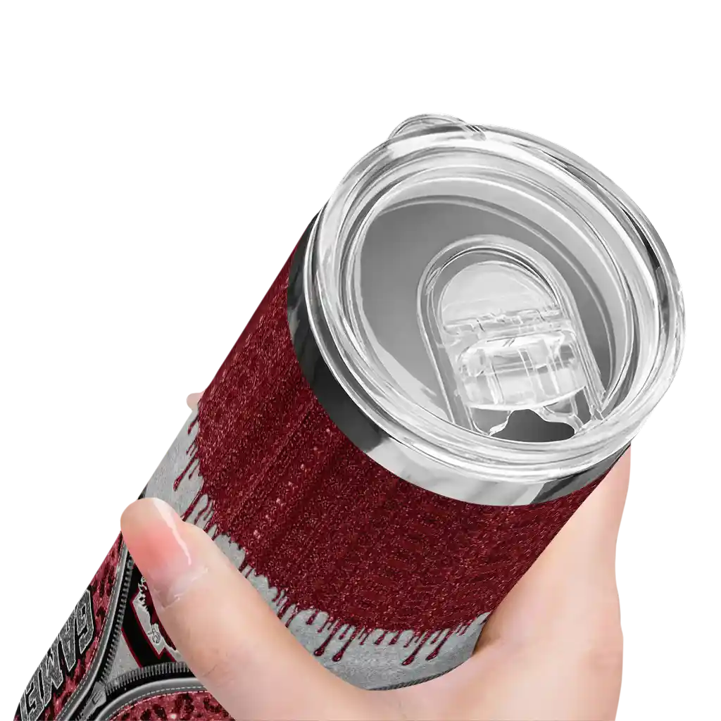 The Personalized South Carolina Gamecocks Sparkle Drip Garnet Skinny Tumbler tumbler is the perfect way to stay refreshed while showing off your pride for South Carolina Gamecocks. With its double-wall insulation, your drinks stay at the right temperature for hours, whether you're enjoying a hot coffee or keeping your iced drink cold. What's inside? You’ll find 1 stainless steel tumbler, 1 clear lid, and 1 removable straw. It's the perfect blend of function and fan spirit! Ergonomically designed for comfort, made from durable stainless steel, and insulated to maintain your drink’s temperature, this tumbler is a must-have for any dedicated NCAA fan.