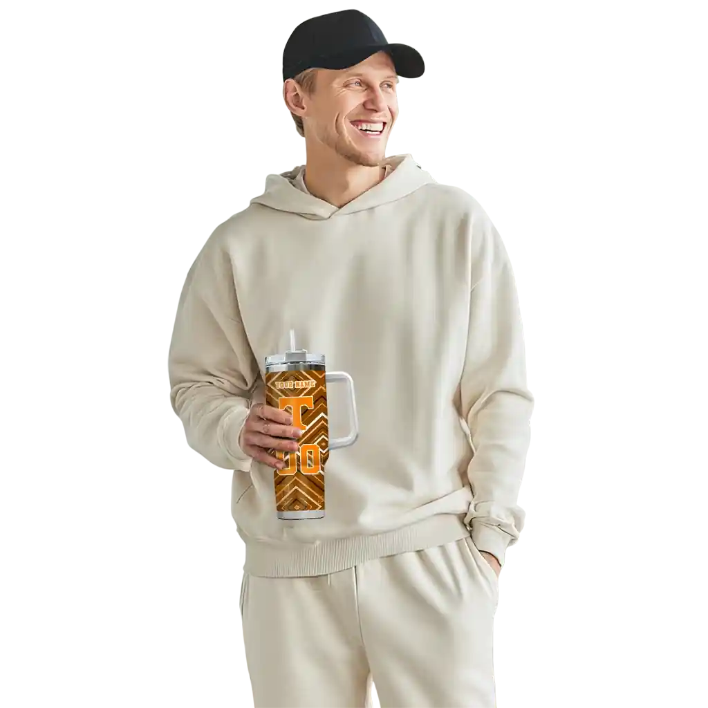 The Tennessee Volunteers Curved Tumbler – Custom Burst Swirl Orange is a double-wall insulated stainless steel tumbler designed to maintain your beverage’s ideal temperature. It features an ergonomic curved design for an easy grip and a tough stainless steel build. The item includes the tumbler, a clear lid, and a removable straw. It is easy to clean and low-maintenance. You can personalize this tumbler by adding both a custom name and number of your choice during the ordering process.