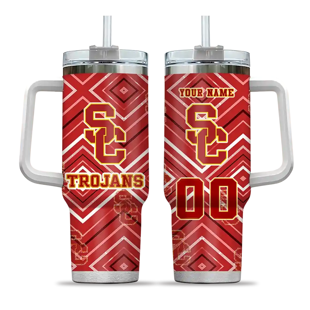 The USC Trojans Curved Tumbler – Personalized Bold Diamonds Red is a double-wall insulated stainless steel tumbler designed to maintain your beverage’s ideal temperature. It features an ergonomic curved design for an easy grip and a tough stainless steel build. The item includes the tumbler, a clear lid, and a removable straw. It is easy to clean and low-maintenance. You can personalize this tumbler by adding both a custom name and number of your choice during the ordering process.