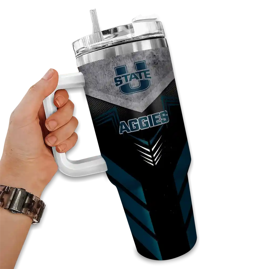 The Utah State Aggies Curved Tumbler – Custom Hexagon Armor Navy is a double-wall insulated stainless steel tumbler designed to maintain your beverage’s ideal temperature. It features an ergonomic curved design for an easy grip and a tough stainless steel build. The item includes the tumbler, a clear lid, and a removable straw. It is easy to clean and low-maintenance. You can personalize this tumbler by adding both a custom name and number of your choice during the ordering process.