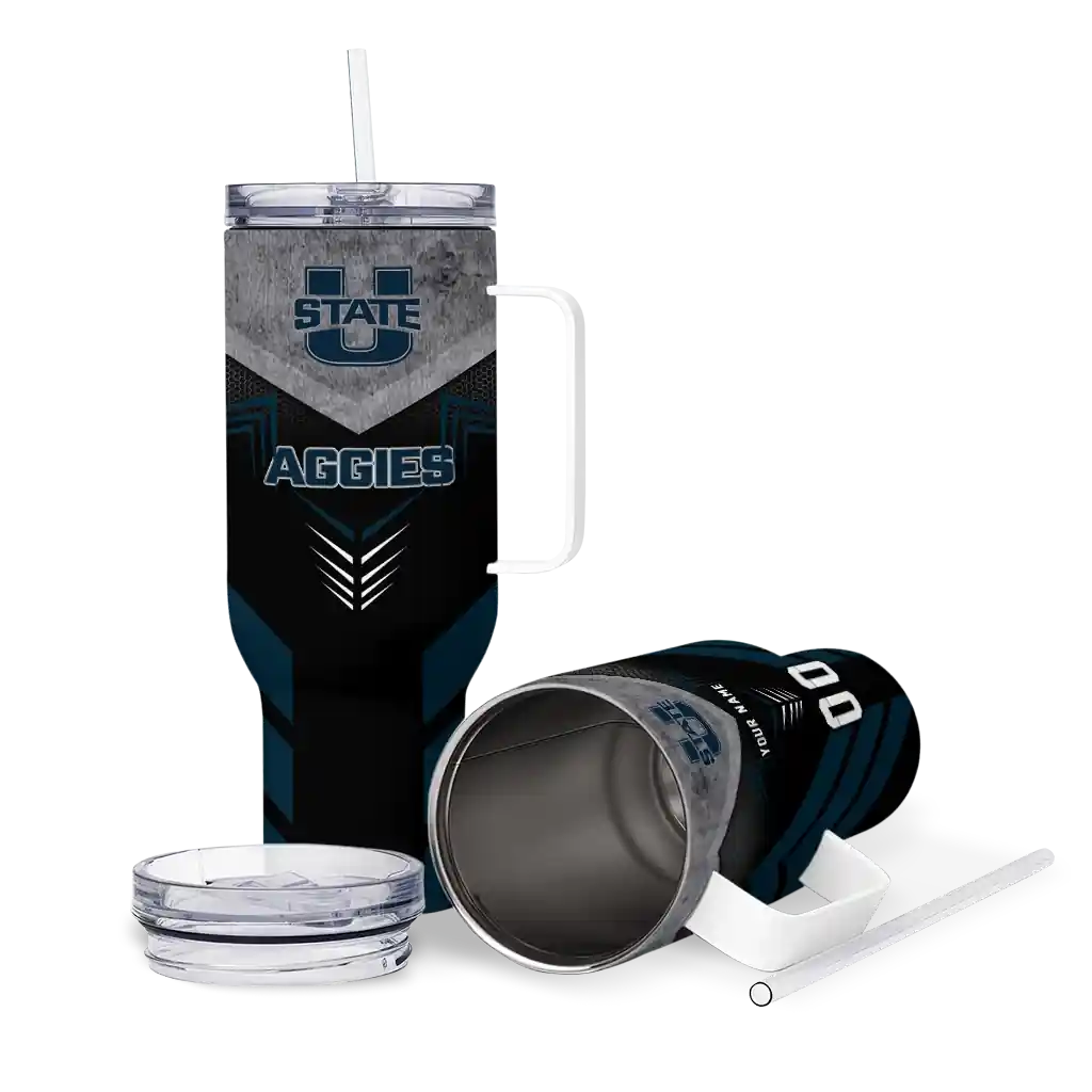 The Utah State Aggies Curved Tumbler – Personalized Arrow Armor Navy Black is a double-wall insulated stainless steel tumbler designed to maintain your beverage’s ideal temperature. It features an ergonomic curved design for an easy grip and a tough stainless steel build. The item includes the tumbler, a clear lid, and a removable straw. It is easy to clean and low-maintenance. You can personalize this tumbler by adding both a custom name and number of your choice during the ordering process.