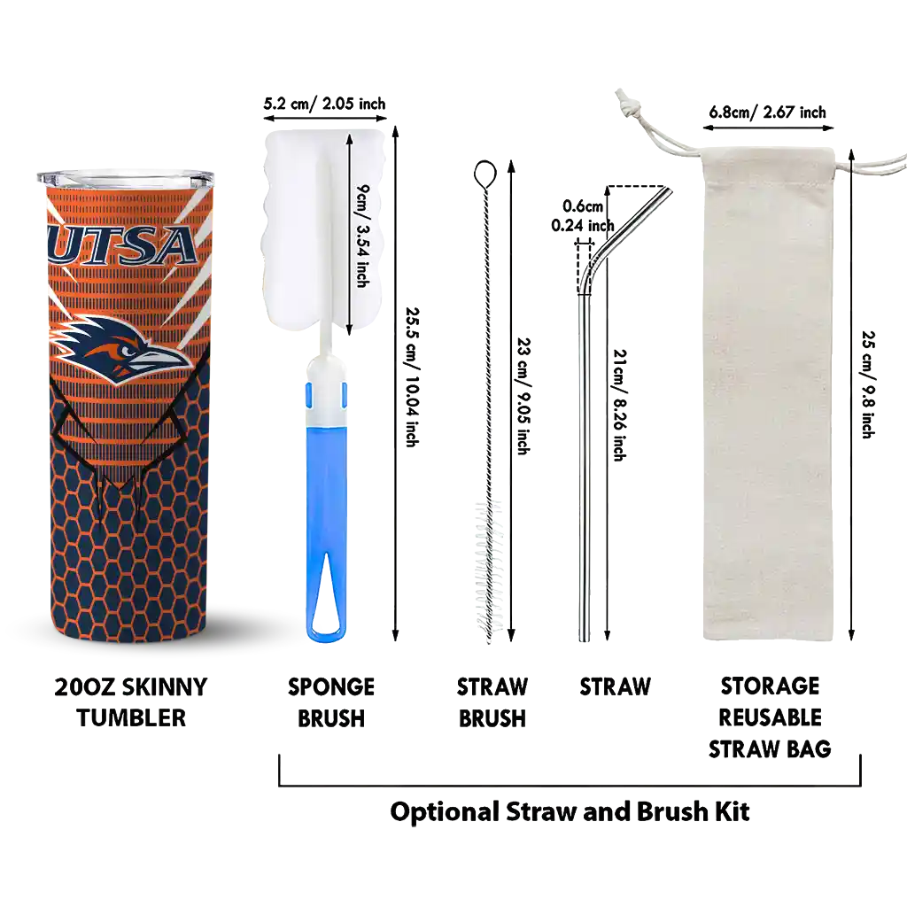 The Personalized UTSA Roadrunners Chevron Stripes Orange Skinny Tumbler tumbler is the perfect way to stay refreshed while showing off your pride for UTSA Roadrunners. With its double-wall insulation, your drinks stay at the right temperature for hours, whether you're enjoying a hot coffee or keeping your iced drink cold. What's inside? You’ll find 1 stainless steel tumbler, 1 clear lid, and 1 removable straw. It's the perfect blend of function and fan spirit! Ergonomically designed for comfort, made from durable stainless steel, and insulated to maintain your drink’s temperature, this tumbler is a must-have for any dedicated NCAA fan.
