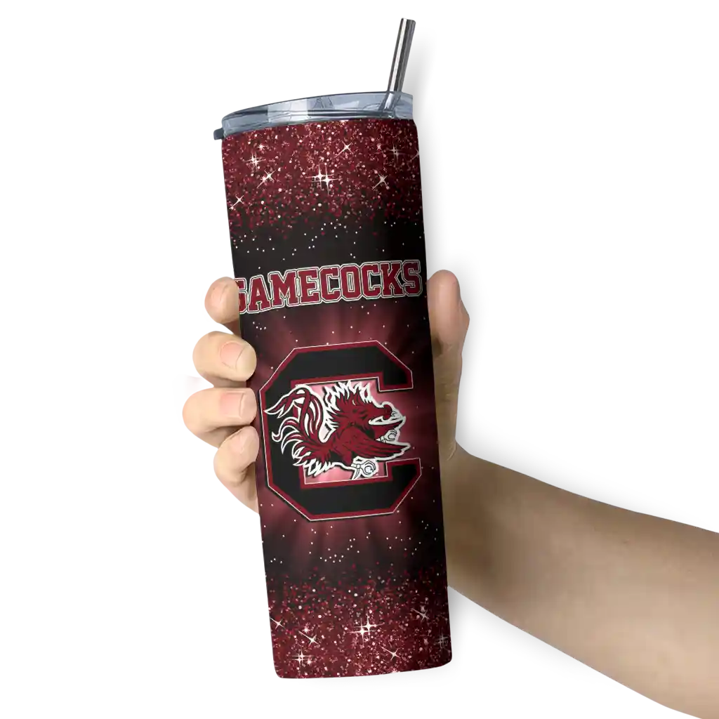 The Personalized South Carolina Gamecocks Sparkle Drip Garnet Skinny Tumbler tumbler is the perfect way to stay refreshed while showing off your pride for South Carolina Gamecocks. With its double-wall insulation, your drinks stay at the right temperature for hours, whether you're enjoying a hot coffee or keeping your iced drink cold. What's inside? You’ll find 1 stainless steel tumbler, 1 clear lid, and 1 removable straw. It's the perfect blend of function and fan spirit! Ergonomically designed for comfort, made from durable stainless steel, and insulated to maintain your drink’s temperature, this tumbler is a must-have for any dedicated NCAA fan.
