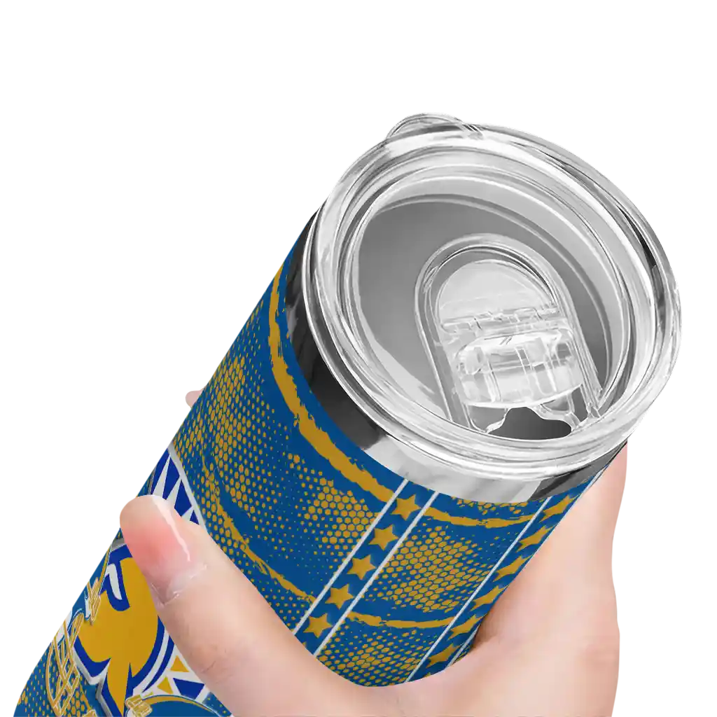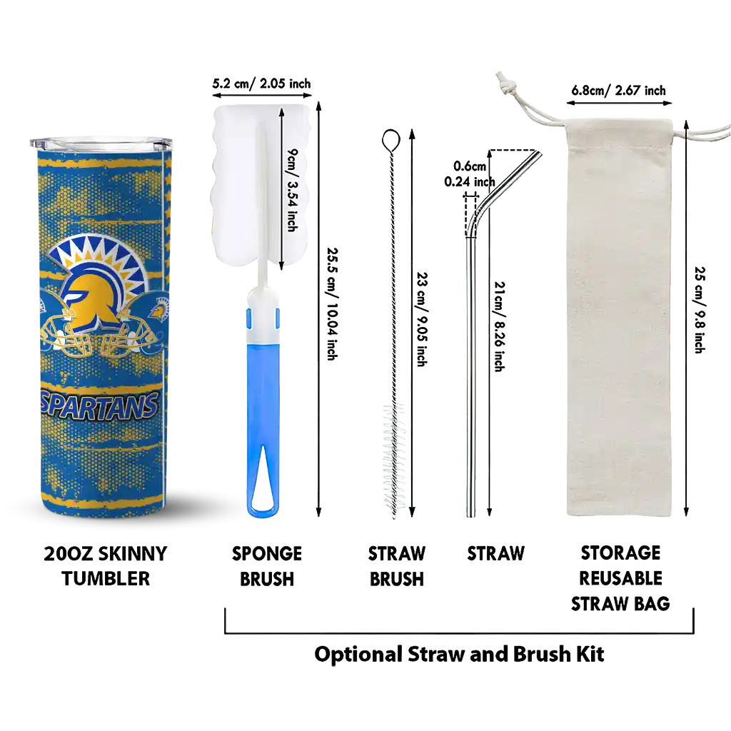 The Custom San Jose State Spartans Chevron Patch Blue Skinny Tumbler tumbler is the perfect way to stay refreshed while showing off your pride for San Jose State Spartans. With its double-wall insulation, your drinks stay at the right temperature for hours, whether you're enjoying a hot coffee or keeping your iced drink cold. What's inside? You’ll find 1 stainless steel tumbler, 1 clear lid, and 1 removable straw. It's the perfect blend of function and fan spirit! Ergonomically designed for comfort, made from durable stainless steel, and insulated to maintain your drink’s temperature, this tumbler is a must-have for any dedicated NCAA fan.