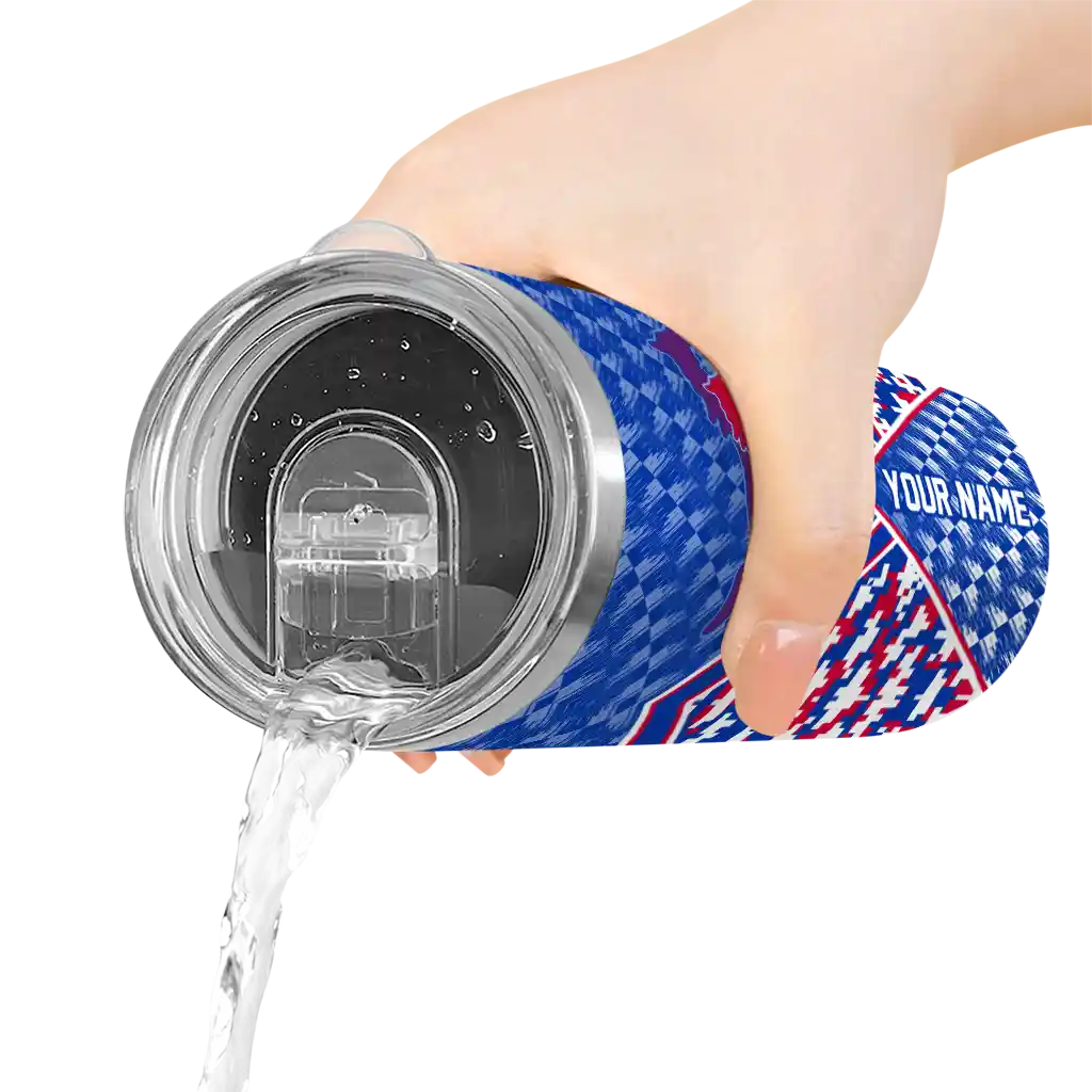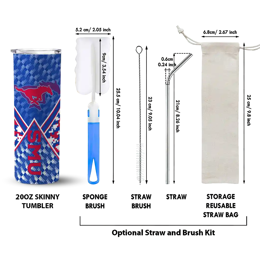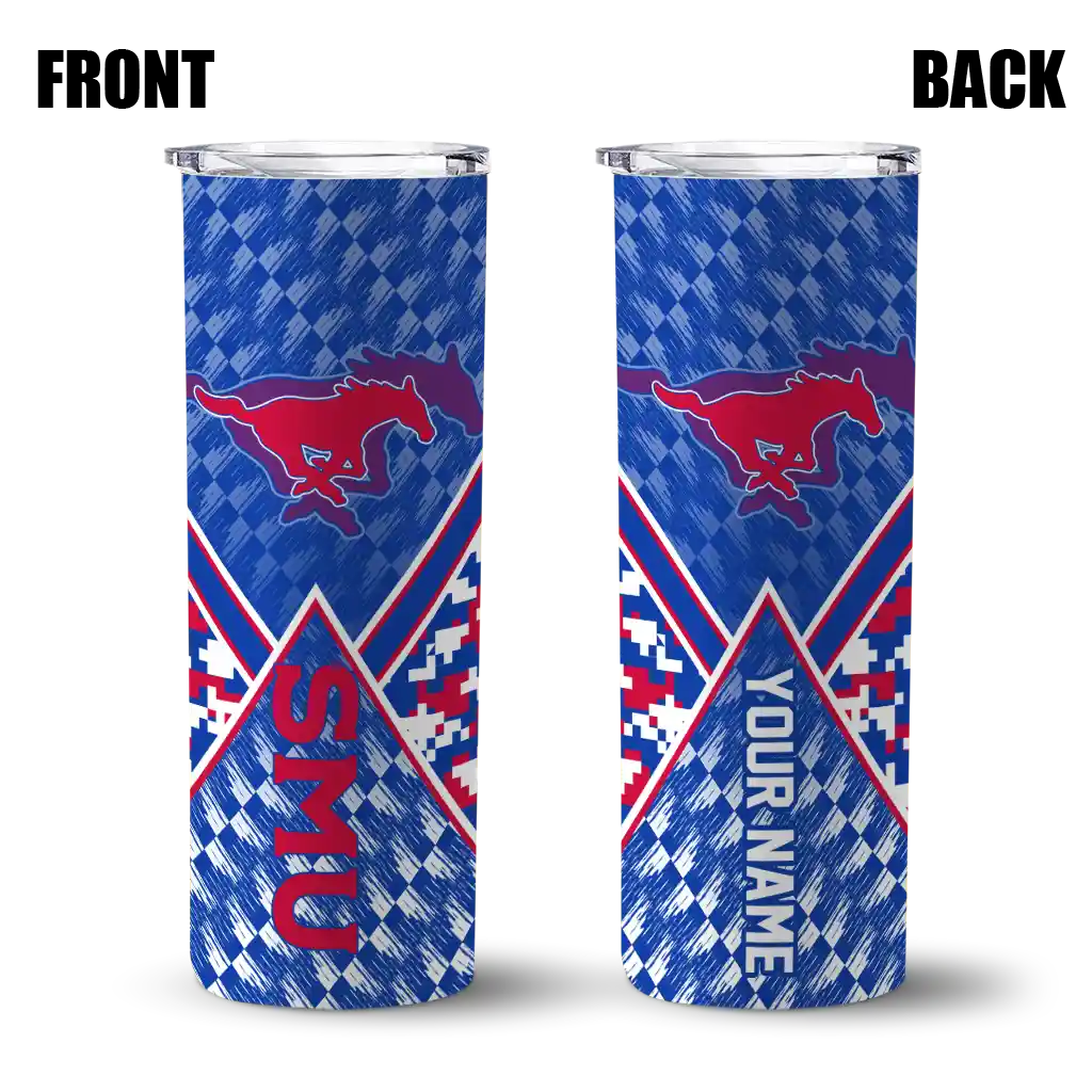 The Custom SMU Mustangs Helmet Belt Blue Black Skinny Tumbler tumbler is the perfect way to stay refreshed while showing off your pride for SMU Mustangs. With its double-wall insulation, your drinks stay at the right temperature for hours, whether you're enjoying a hot coffee or keeping your iced drink cold. What's inside? You’ll find 1 stainless steel tumbler, 1 clear lid, and 1 removable straw. It's the perfect blend of function and fan spirit! Ergonomically designed for comfort, made from durable stainless steel, and insulated to maintain your drink’s temperature, this tumbler is a must-have for any dedicated NCAA fan.