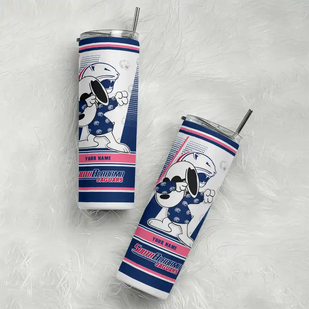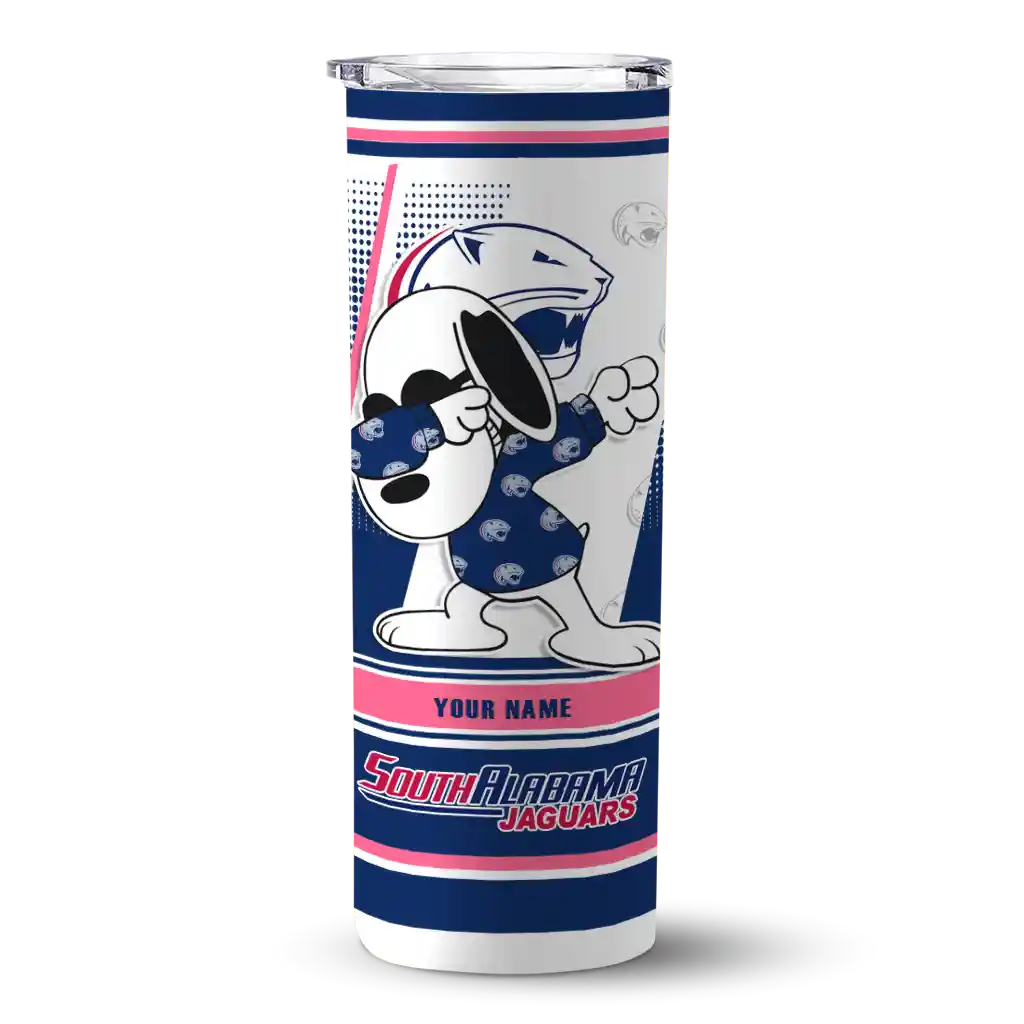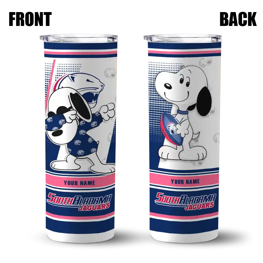 Customized South Alabama Jaguars Snoopy Dog Blue White Skinny Tumbler