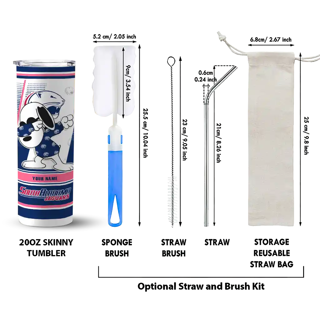 The Customized South Alabama Jaguars Snoopy Dog Blue White Skinny Tumbler tumbler is the perfect way to stay refreshed while showing off your pride for South Alabama Jaguars. With its double-wall insulation, your drinks stay at the right temperature for hours, whether you're enjoying a hot coffee or keeping your iced drink cold. What's inside? You’ll find 1 stainless steel tumbler, 1 clear lid, and 1 removable straw. It's the perfect blend of function and fan spirit! Ergonomically designed for comfort, made from durable stainless steel, and insulated to maintain your drink’s temperature, this tumbler is a must-have for any dedicated NCAA fan.