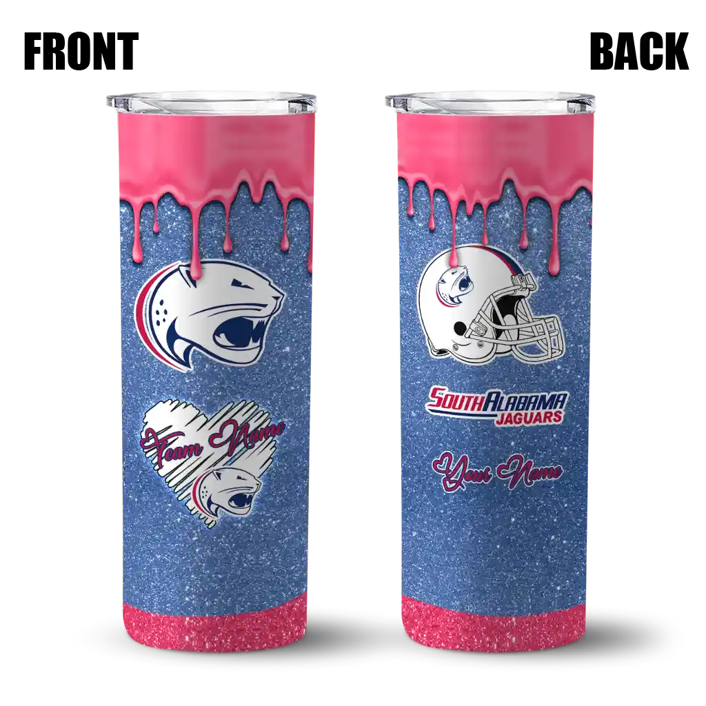 Personalized South Alabama Jaguars Pixel Fade Blue Skinny Tumbler