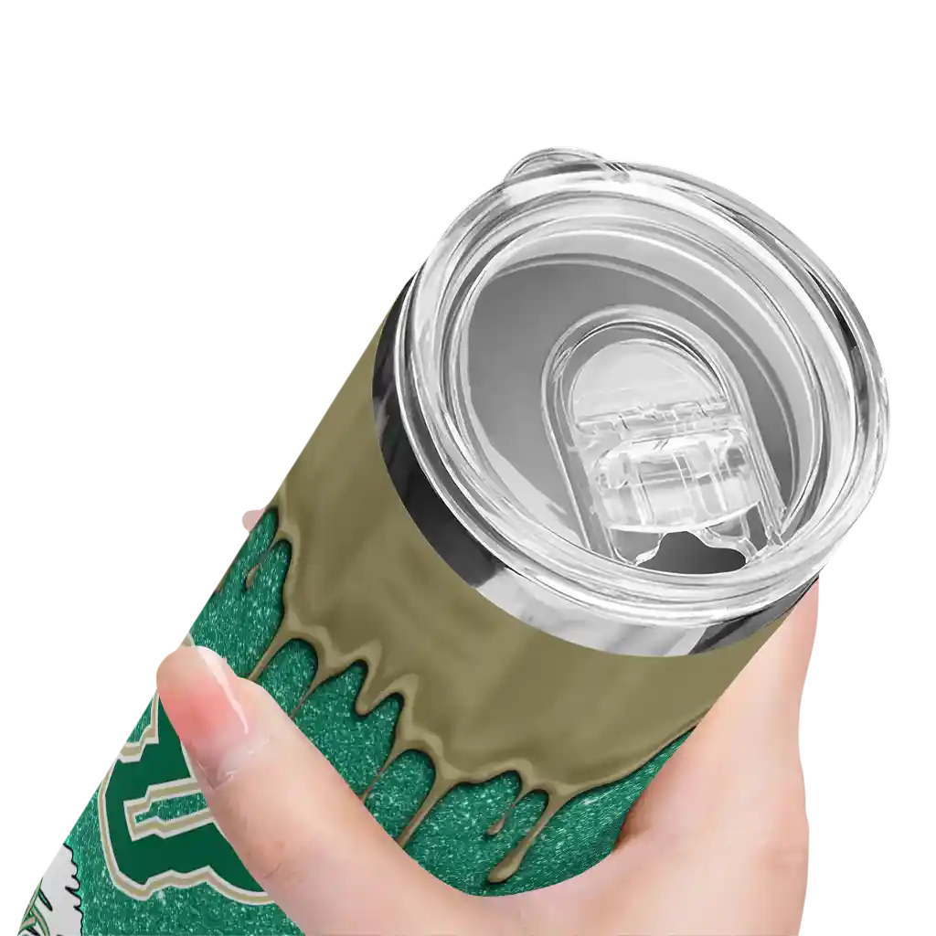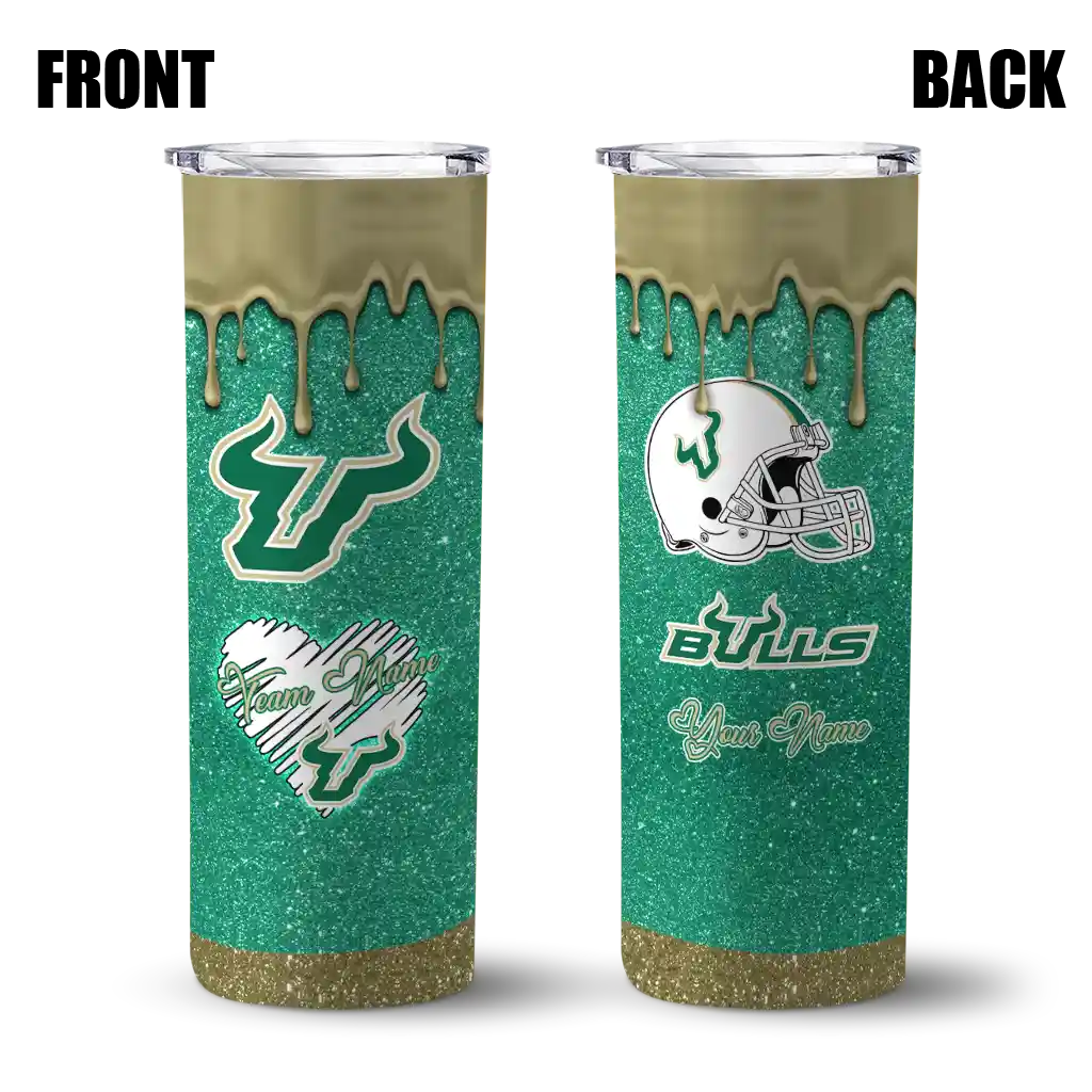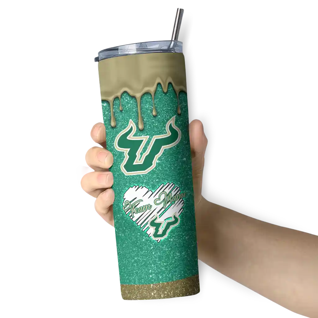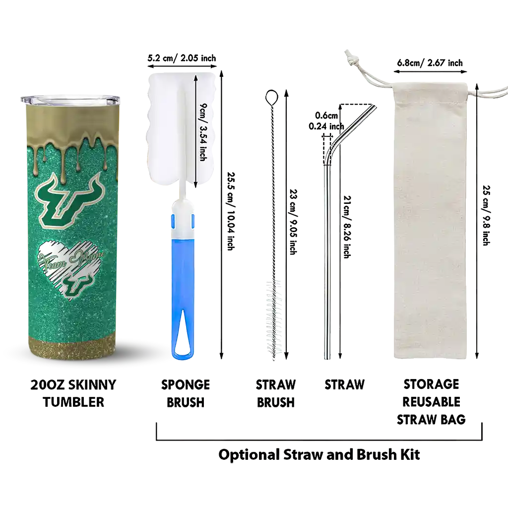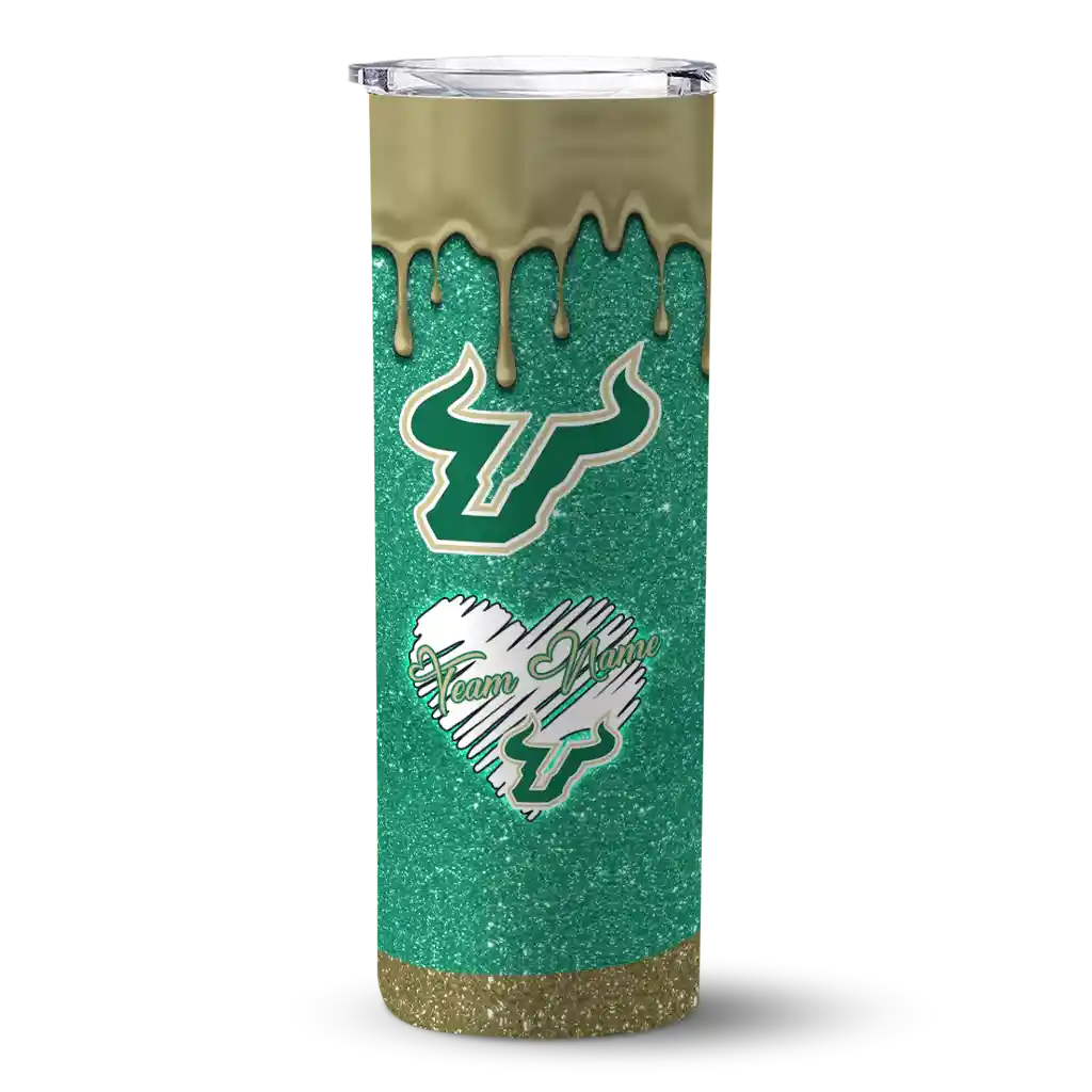 The Custom South Florida Bulls Sparkle Drip Green Skinny Tumbler tumbler is the perfect way to stay refreshed while showing off your pride for South Florida Bulls. With its double-wall insulation, your drinks stay at the right temperature for hours, whether you're enjoying a hot coffee or keeping your iced drink cold. What's inside? You’ll find 1 stainless steel tumbler, 1 clear lid, and 1 removable straw. It's the perfect blend of function and fan spirit! Ergonomically designed for comfort, made from durable stainless steel, and insulated to maintain your drink’s temperature, this tumbler is a must-have for any dedicated NCAA fan.
