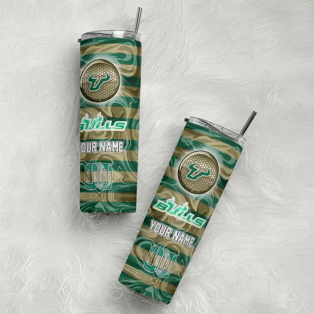 The Personalized South Florida Bulls Patterned Waves Green Skinny Tumbler tumbler is the perfect way to stay refreshed while showing off your pride for South Florida Bulls. With its double-wall insulation, your drinks stay at the right temperature for hours, whether you're enjoying a hot coffee or keeping your iced drink cold. What's inside? You’ll find 1 stainless steel tumbler, 1 clear lid, and 1 removable straw. It's the perfect blend of function and fan spirit! Ergonomically designed for comfort, made from durable stainless steel, and insulated to maintain your drink’s temperature, this tumbler is a must-have for any dedicated NCAA fan.