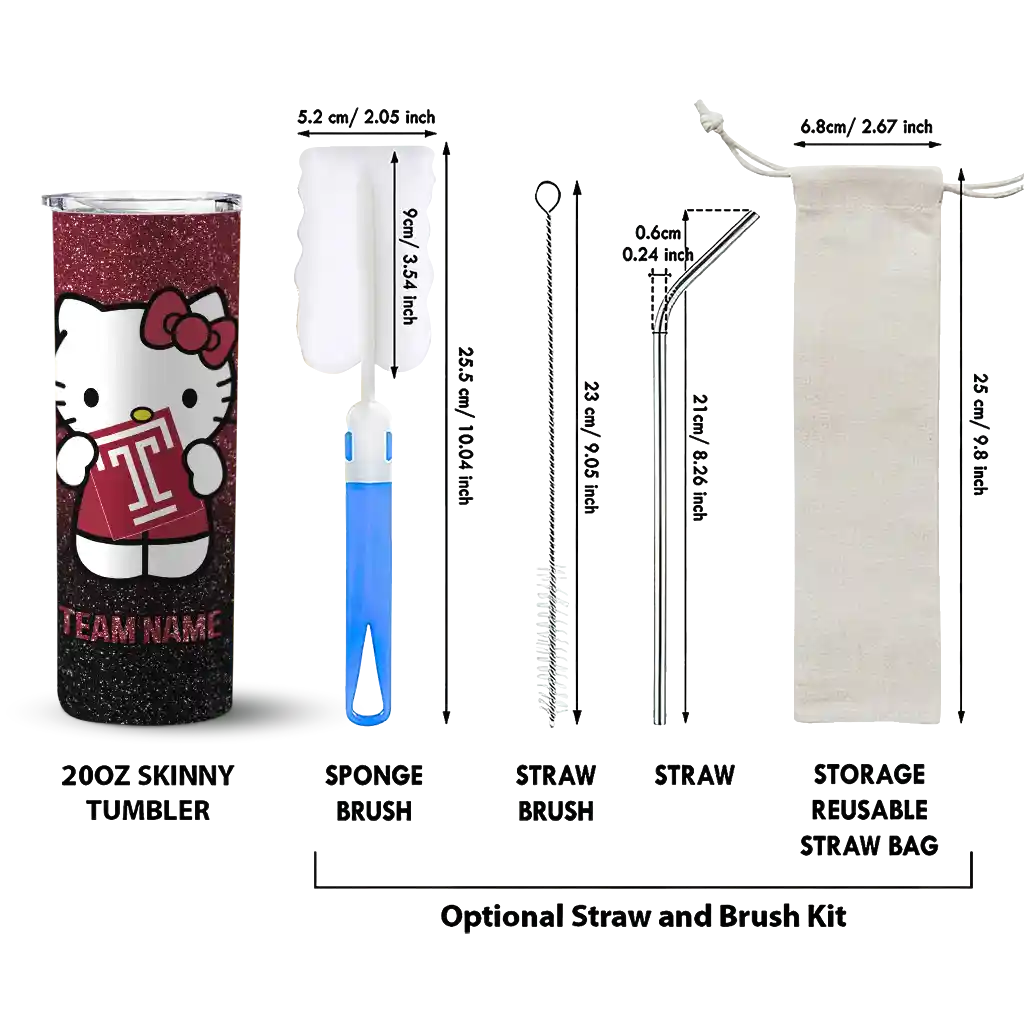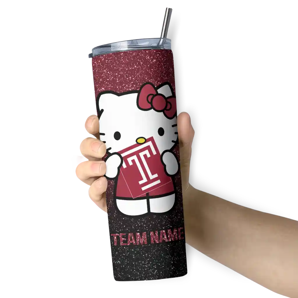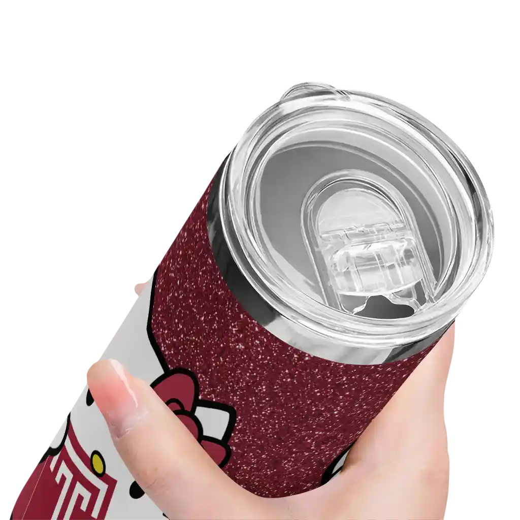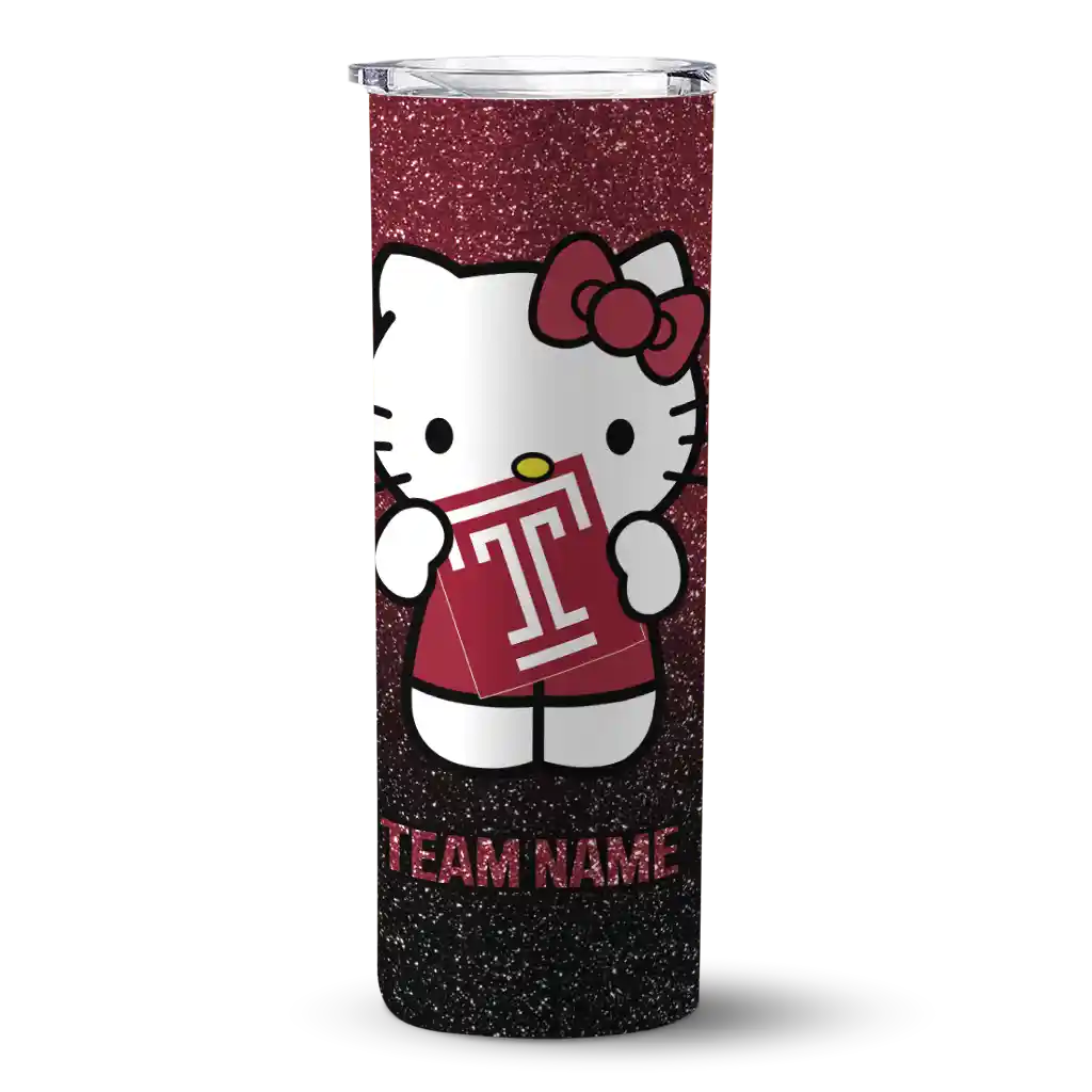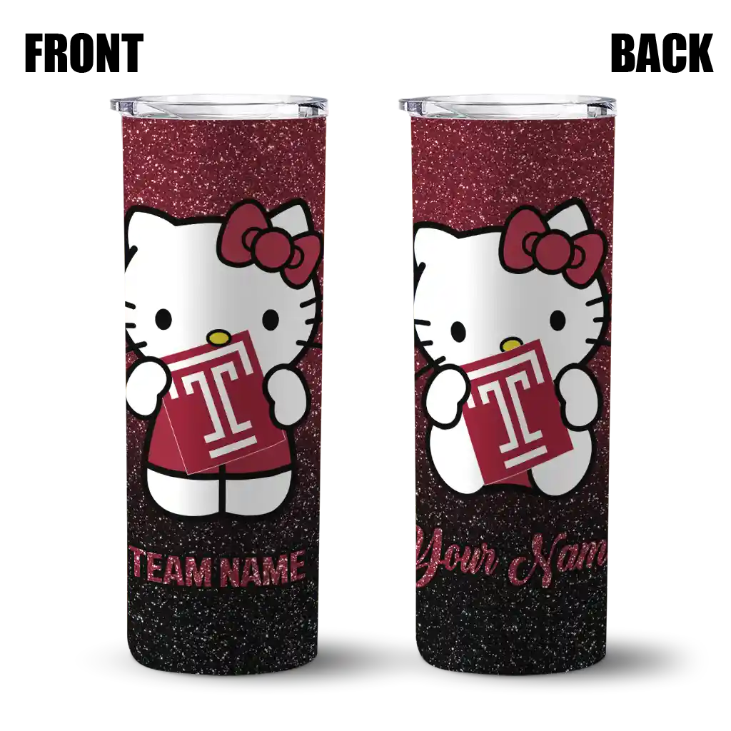 The Customized Temple Owls Hello Kitty Red Black Skinny Tumbler tumbler is the perfect way to stay refreshed while showing off your pride for Temple Owls. With its double-wall insulation, your drinks stay at the right temperature for hours, whether you're enjoying a hot coffee or keeping your iced drink cold. What's inside? You’ll find 1 stainless steel tumbler, 1 clear lid, and 1 removable straw. It's the perfect blend of function and fan spirit! Ergonomically designed for comfort, made from durable stainless steel, and insulated to maintain your drink’s temperature, this tumbler is a must-have for any dedicated NCAA fan.