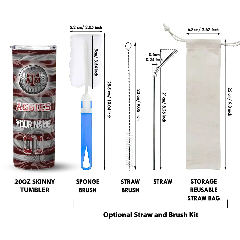 The Customized Texas A&M Aggies Patterned Waves Maroon Skinny Tumbler tumbler is the perfect way to stay refreshed while showing off your pride for Texas A&M Aggies. With its double-wall insulation, your drinks stay at the right temperature for hours, whether you're enjoying a hot coffee or keeping your iced drink cold. What's inside? You’ll find 1 stainless steel tumbler, 1 clear lid, and 1 removable straw. It's the perfect blend of function and fan spirit! Ergonomically designed for comfort, made from durable stainless steel, and insulated to maintain your drink’s temperature, this tumbler is a must-have for any dedicated NCAA fan.
