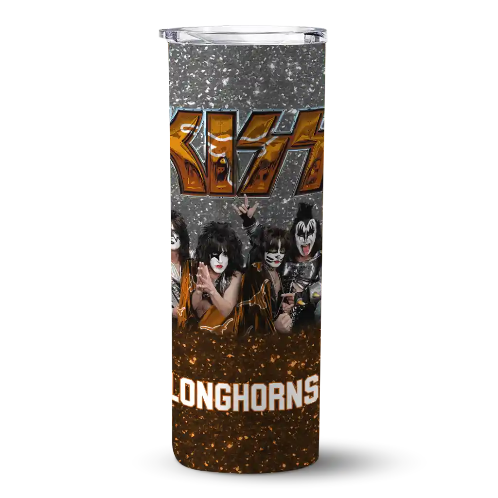 The Personalized Texas Longhorns Kiss Band White Skinny Tumbler tumbler is the perfect way to stay refreshed while showing off your pride for Texas Longhorns. With its double-wall insulation, your drinks stay at the right temperature for hours, whether you're enjoying a hot coffee or keeping your iced drink cold. What's inside? You’ll find 1 stainless steel tumbler, 1 clear lid, and 1 removable straw. It's the perfect blend of function and fan spirit! Ergonomically designed for comfort, made from durable stainless steel, and insulated to maintain your drink’s temperature, this tumbler is a must-have for any dedicated NCAA fan.