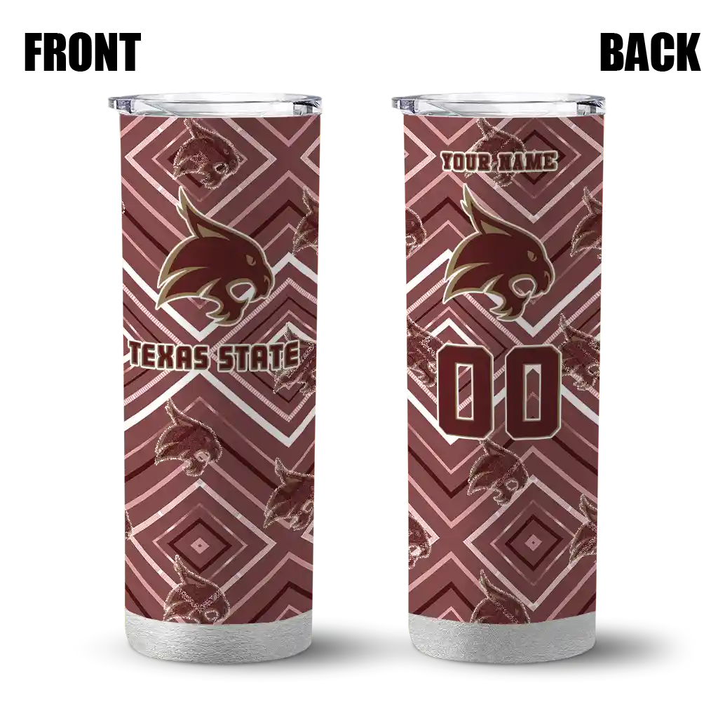 No question about it—the Personalized Texas State Bobcats Bold Diamonds Maroon Curved Tumbler is the ultimate way to stay refreshed while rocking your Texas State Bobcats pride. From the stadium to your tailgate, or just chilling at home, this sleek tumbler makes sure you stay hydrated in style. What’s in the box? A stainless steel tumbler, clear lid, and removable straw—all the essentials for keeping your favorite drinks on point!