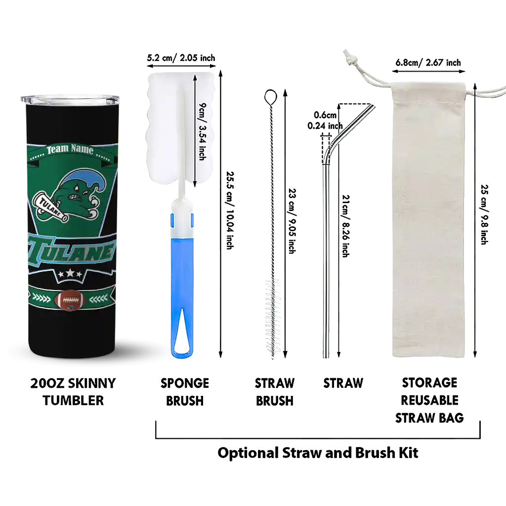 The Personalized Tulane Green Wave Helmet Belt Green Black Skinny Tumbler tumbler is the perfect way to stay refreshed while showing off your pride for Tulane Green Wave. With its double-wall insulation, your drinks stay at the right temperature for hours, whether you're enjoying a hot coffee or keeping your iced drink cold. What's inside? You’ll find 1 stainless steel tumbler, 1 clear lid, and 1 removable straw. It's the perfect blend of function and fan spirit! Ergonomically designed for comfort, made from durable stainless steel, and insulated to maintain your drink’s temperature, this tumbler is a must-have for any dedicated NCAA fan.