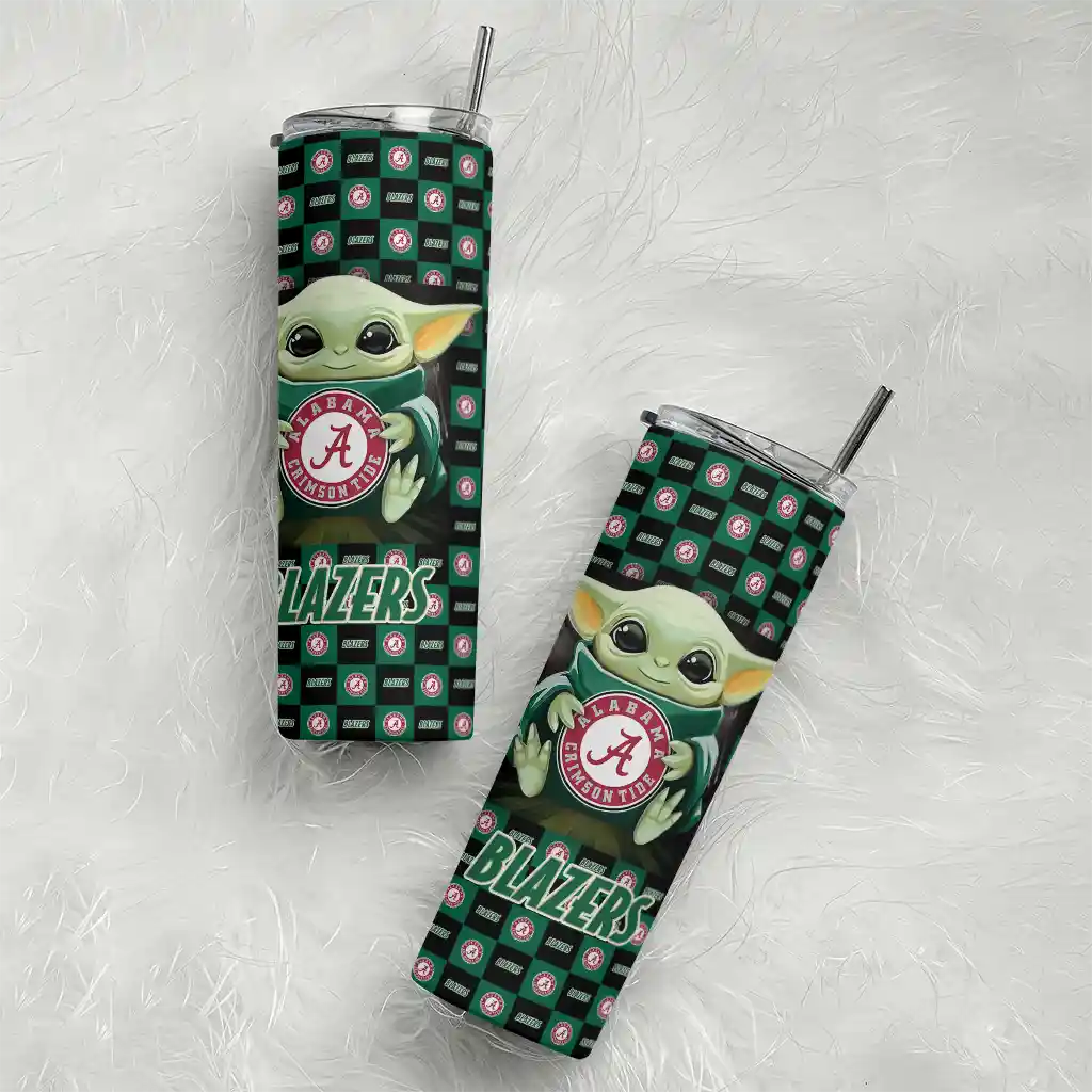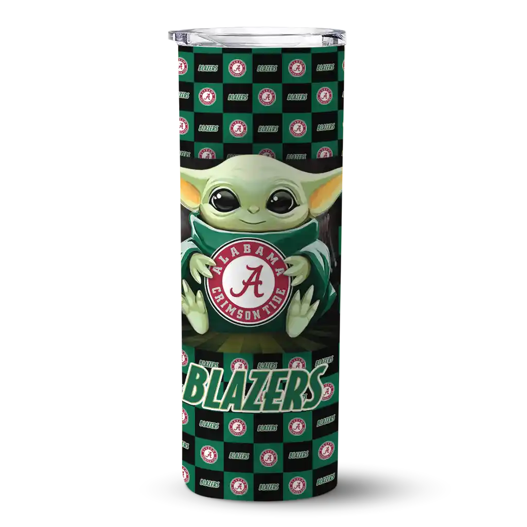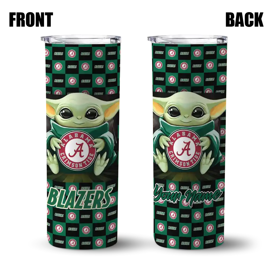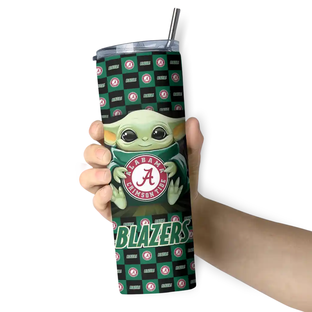 The Personalized UAB Blazers Yoda Cozy Green Black Skinny Tumbler tumbler is the perfect way to stay refreshed while showing off your pride for UAB Blazers. With its double-wall insulation, your drinks stay at the right temperature for hours, whether you're enjoying a hot coffee or keeping your iced drink cold. What's inside? You’ll find 1 stainless steel tumbler, 1 clear lid, and 1 removable straw. It's the perfect blend of function and fan spirit! Ergonomically designed for comfort, made from durable stainless steel, and insulated to maintain your drink’s temperature, this tumbler is a must-have for any dedicated NCAA fan.