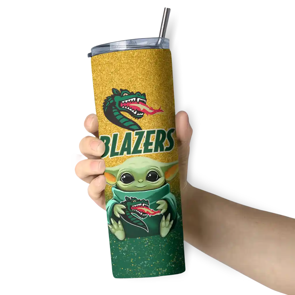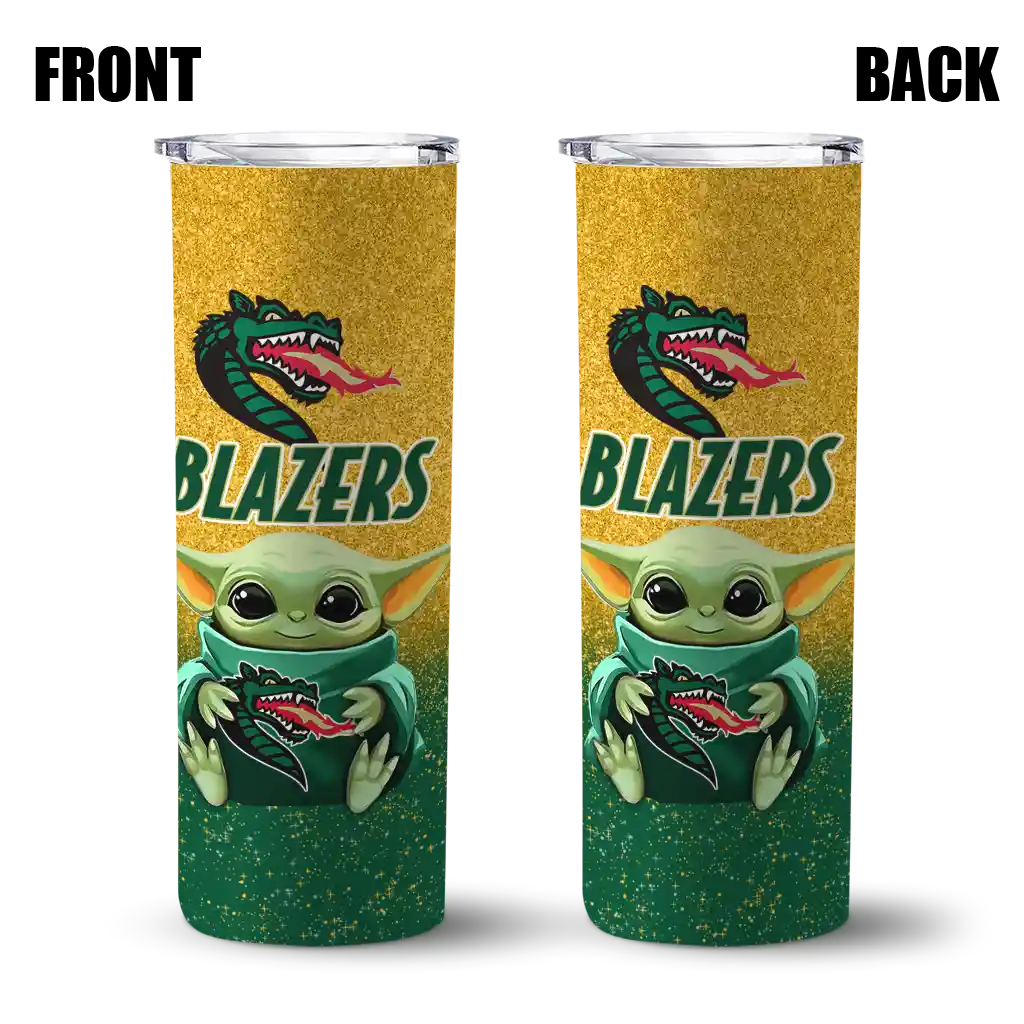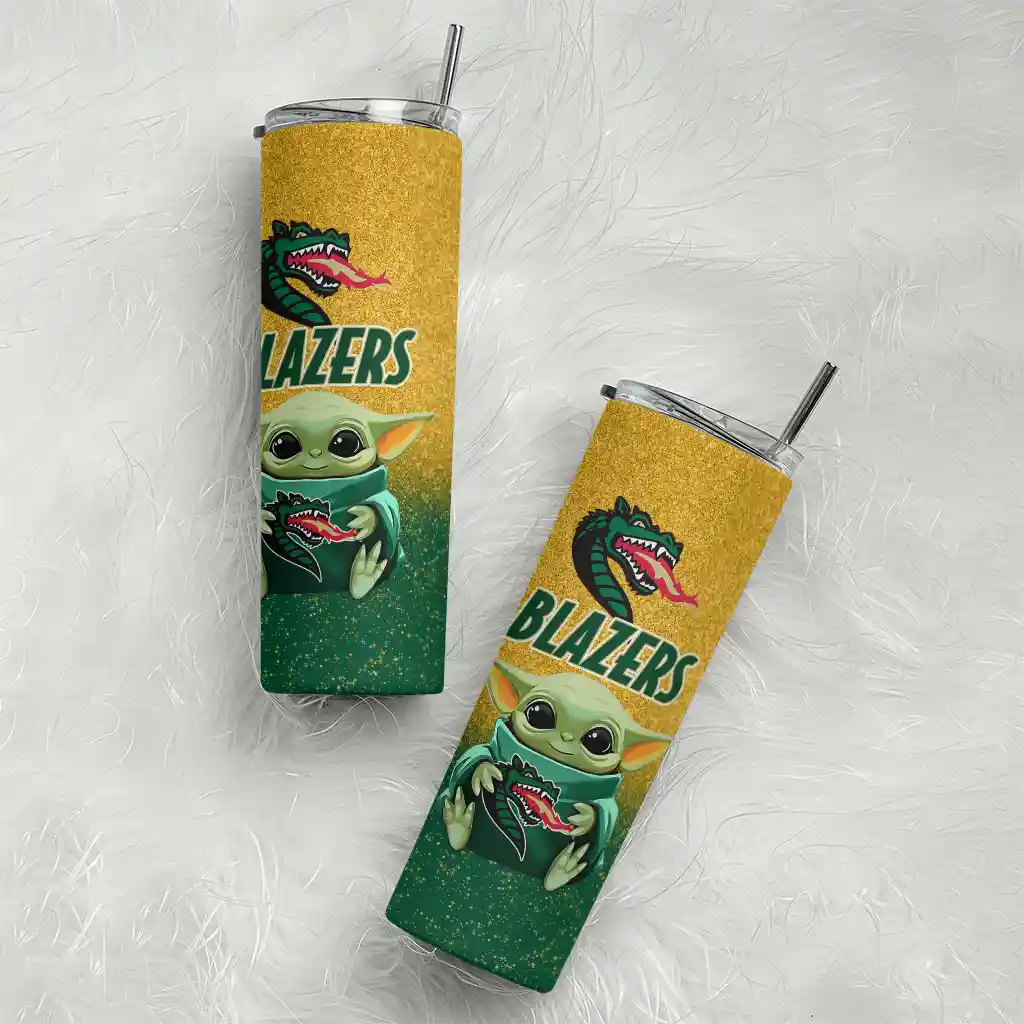 The Personalized UAB Blazers Yoda Cozy Green Black Skinny Tumbler tumbler is the perfect way to stay refreshed while showing off your pride for UAB Blazers. With its double-wall insulation, your drinks stay at the right temperature for hours, whether you're enjoying a hot coffee or keeping your iced drink cold. What's inside? You’ll find 1 stainless steel tumbler, 1 clear lid, and 1 removable straw. It's the perfect blend of function and fan spirit! Ergonomically designed for comfort, made from durable stainless steel, and insulated to maintain your drink’s temperature, this tumbler is a must-have for any dedicated NCAA fan.
