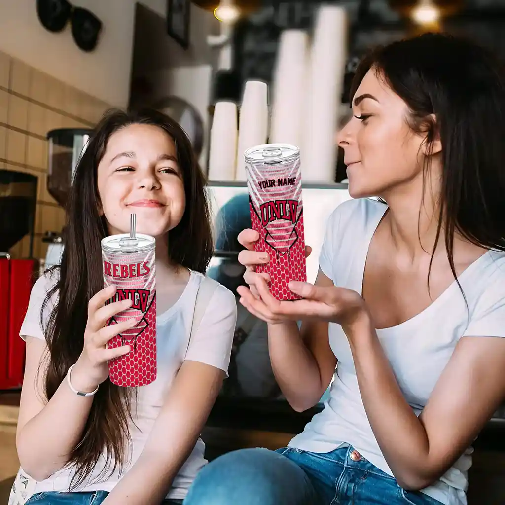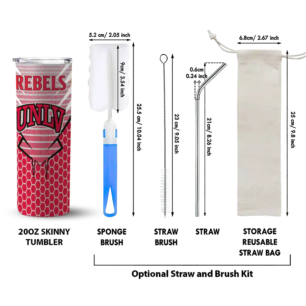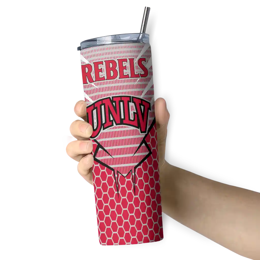 The Custom UNLV Rebels Chevron Stripes Red Skinny Tumbler tumbler is the perfect way to stay refreshed while showing off your pride for UNLV Rebels. With its double-wall insulation, your drinks stay at the right temperature for hours, whether you're enjoying a hot coffee or keeping your iced drink cold. What's inside? You’ll find 1 stainless steel tumbler, 1 clear lid, and 1 removable straw. It's the perfect blend of function and fan spirit! Ergonomically designed for comfort, made from durable stainless steel, and insulated to maintain your drink’s temperature, this tumbler is a must-have for any dedicated NCAA fan.